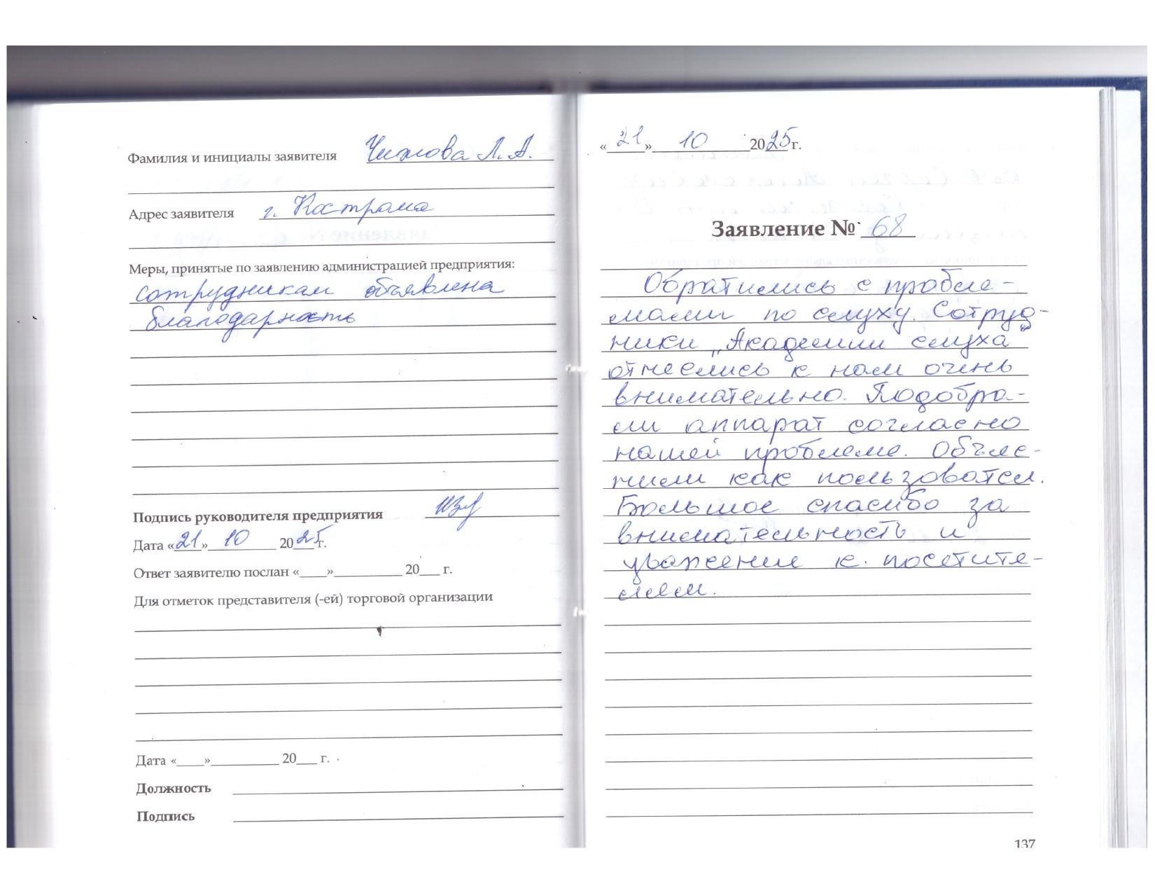Я была на приеме у врача. Мне подобрали 2 слуховых аппарата. Благодарю за доброе отношение. Спасибо за понимание.