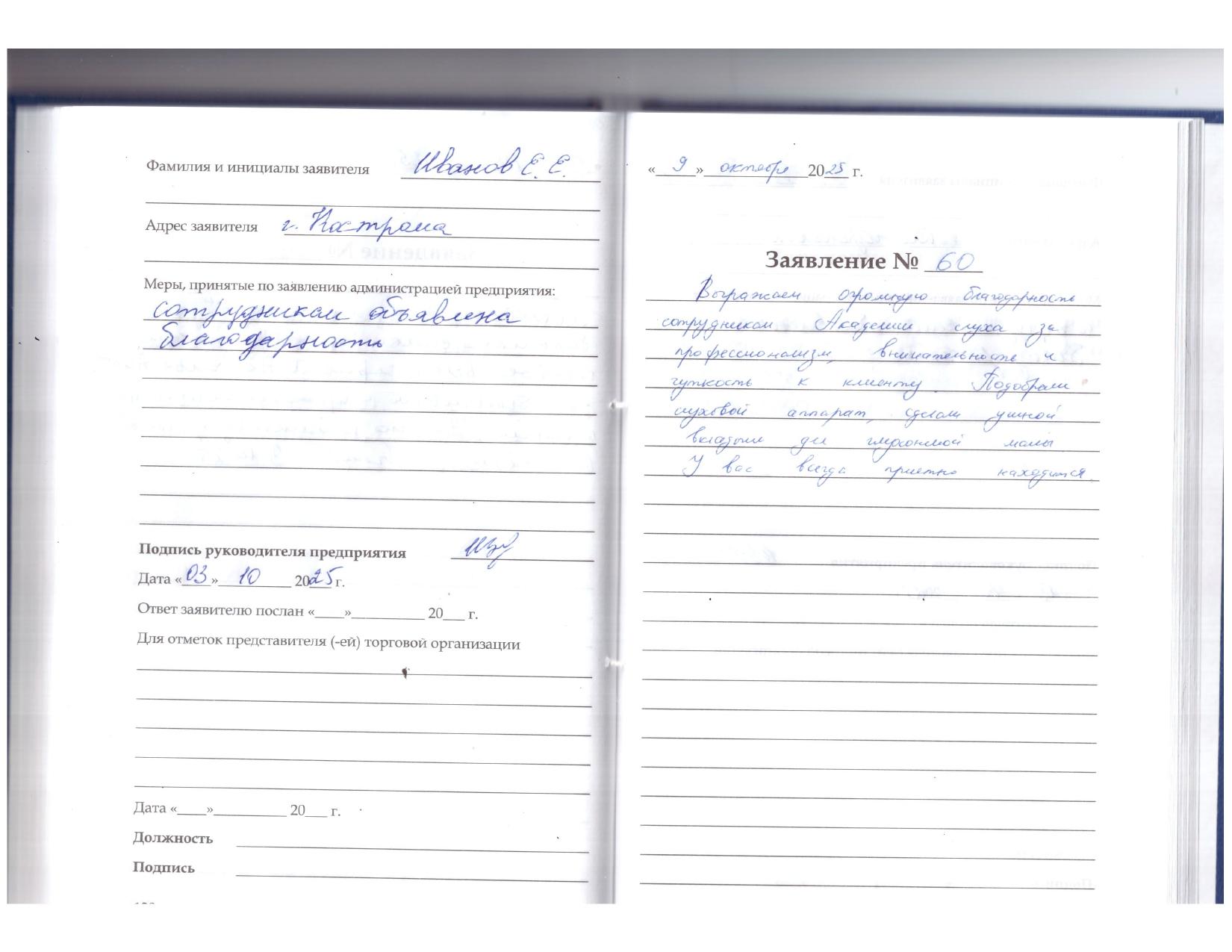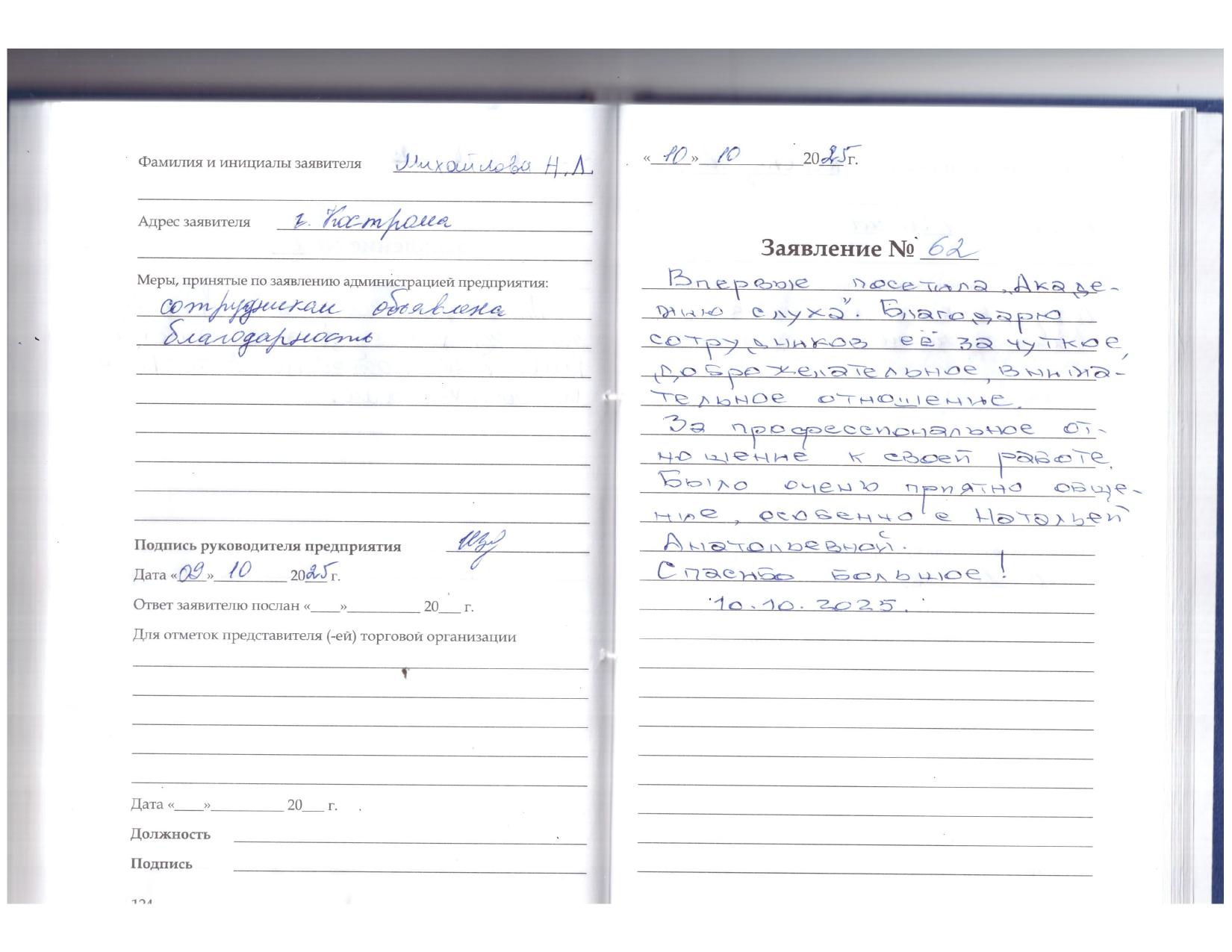 Впервые посетила "Академию слуха". Благодарю сотрудников её за чуткое, доброжелательное, внимательное отношение. За профессиональное отношение к своей работе. Было очень приятно общение, особенно с Натальей Анатольевной. Спасибо большое! 10.10.2025