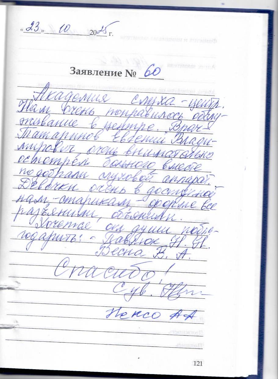 Академия слуха- центр. Нам очень понравилось обслуживание в центре. Врач Татаринов Евгений Владимирович очень внимательно осмотрел больного, вместе подобрали слуховой аппарат. Девочки очень в достойной нам, старикам, форме все разъяснили, объяснили. Хочется от души поблагодарить Павлюк НН., Весна В.А. Спасибо! С уважением Непсо Аскер Айтечевич