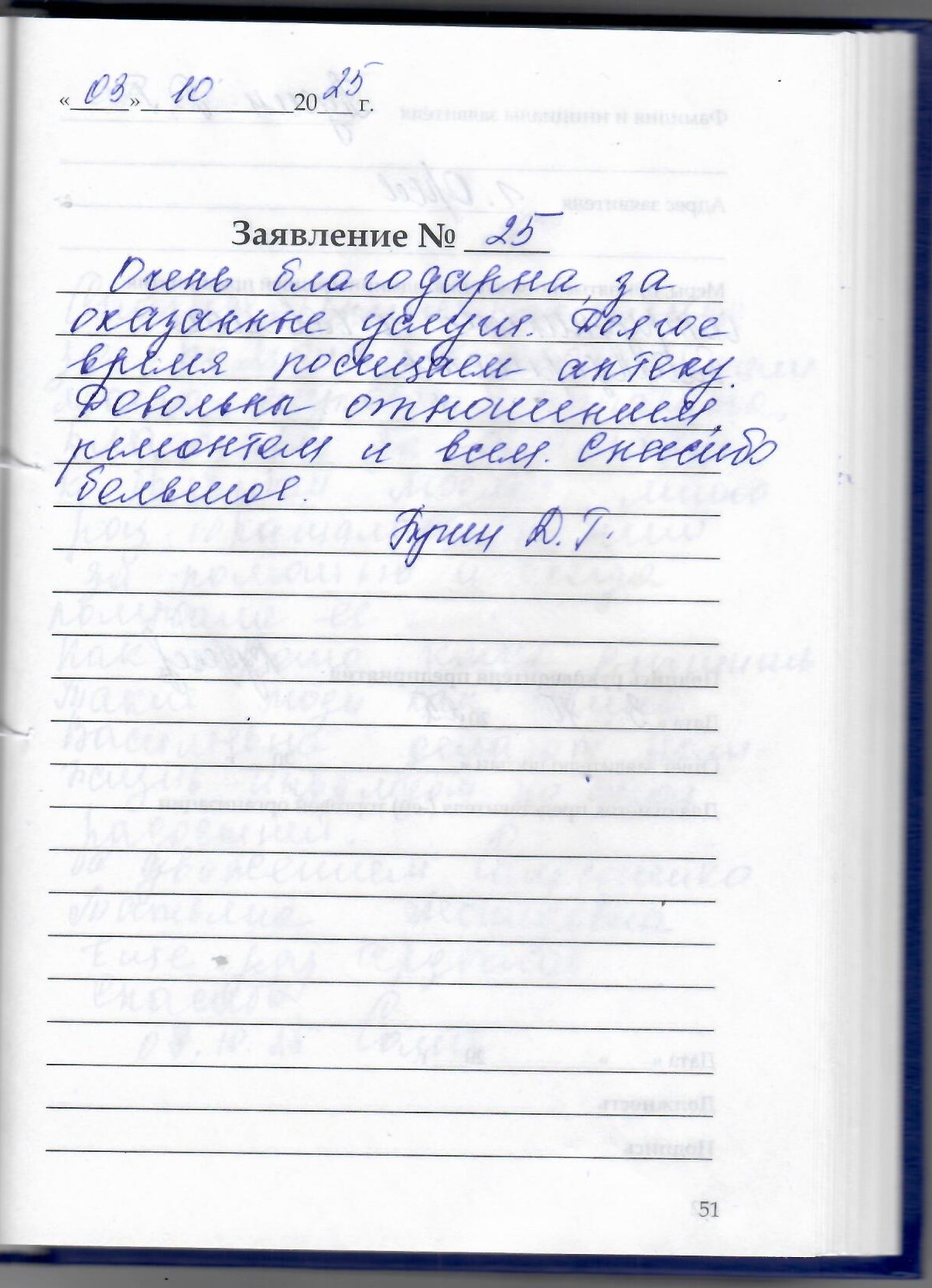 Очень благодарна за оказанные услуги.Долгое время посещаем аптеку. Довольны отношением, ремонтом и всем, спасибо большое.