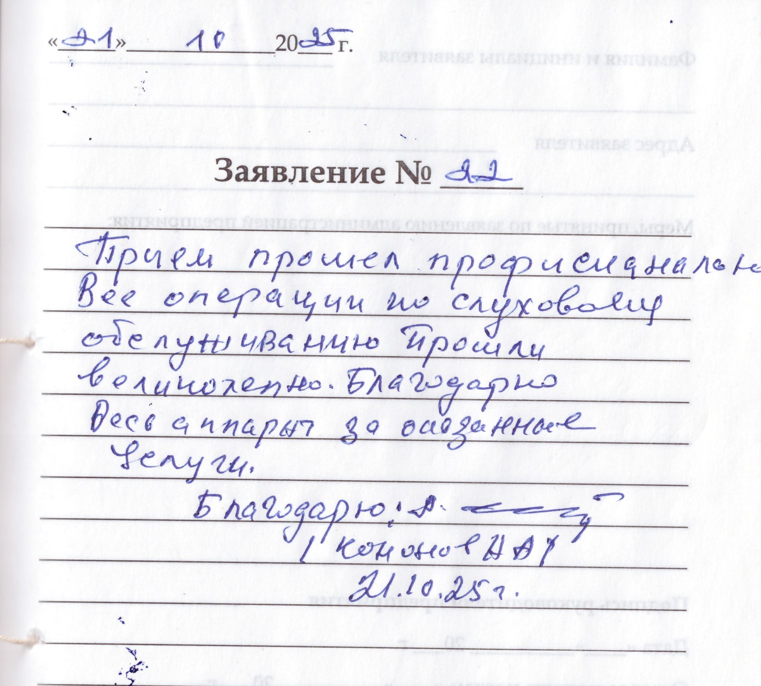 Прием прошел профессионально. Все операции по слуховому обслуживанию прошли великолепно. Благодарю весь аппарат за оказанные услуги. Благодарю.