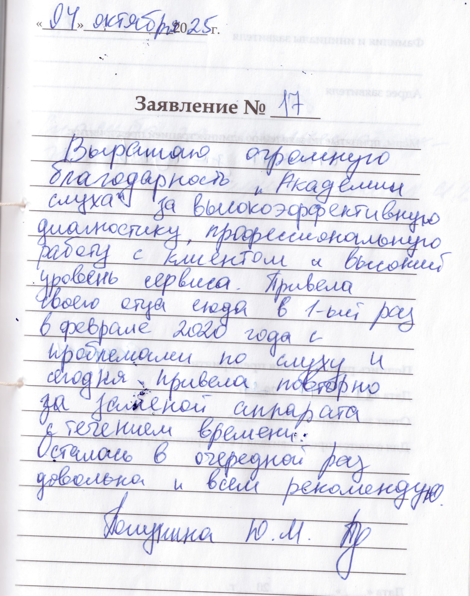 Выражаю огромную благодарность "Академии слуха" за высокоэффективную диагностику, профессиональную работу с клиентом и высокий уровень сервиса. Привела своего отца сюда в 1-ый раз в феврале 2020 года с проблемами по слуху и сегодня привела повторно за заменой аппарата с течением времени . Осталась в очередной раз довольна и всем рекомендую.
