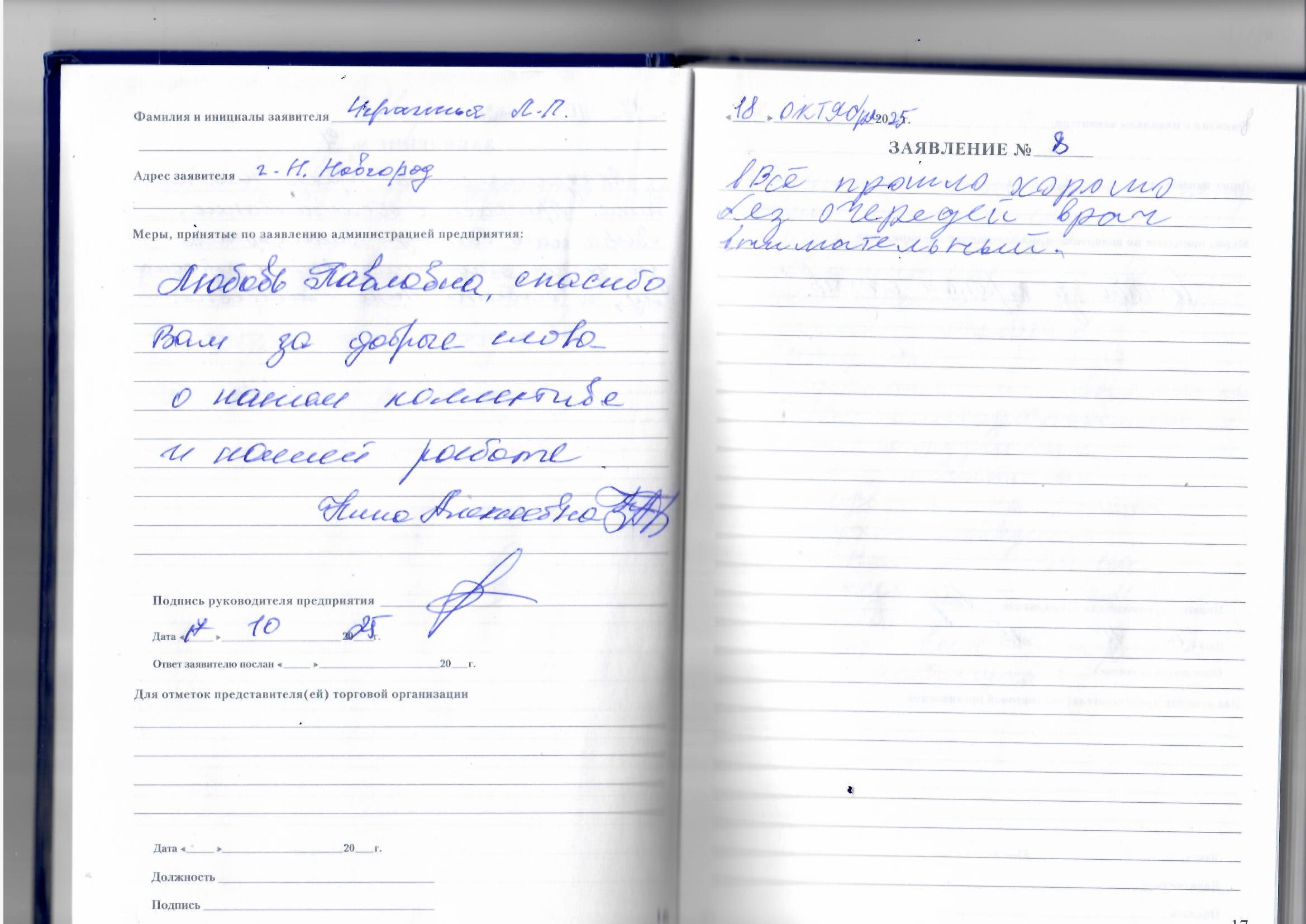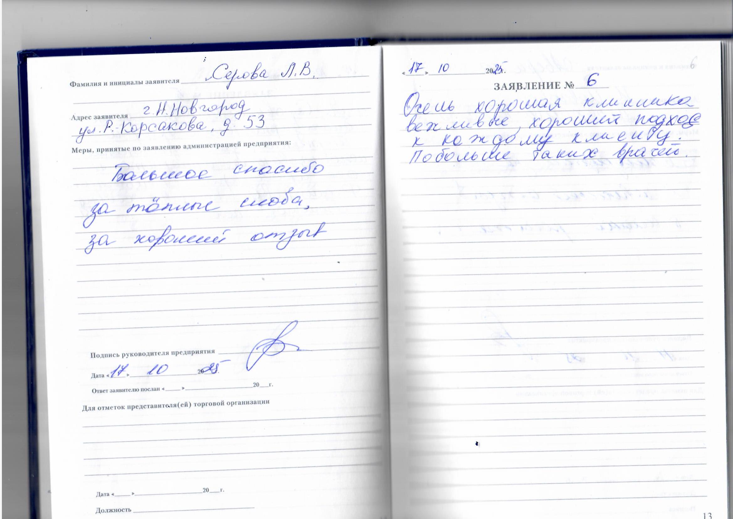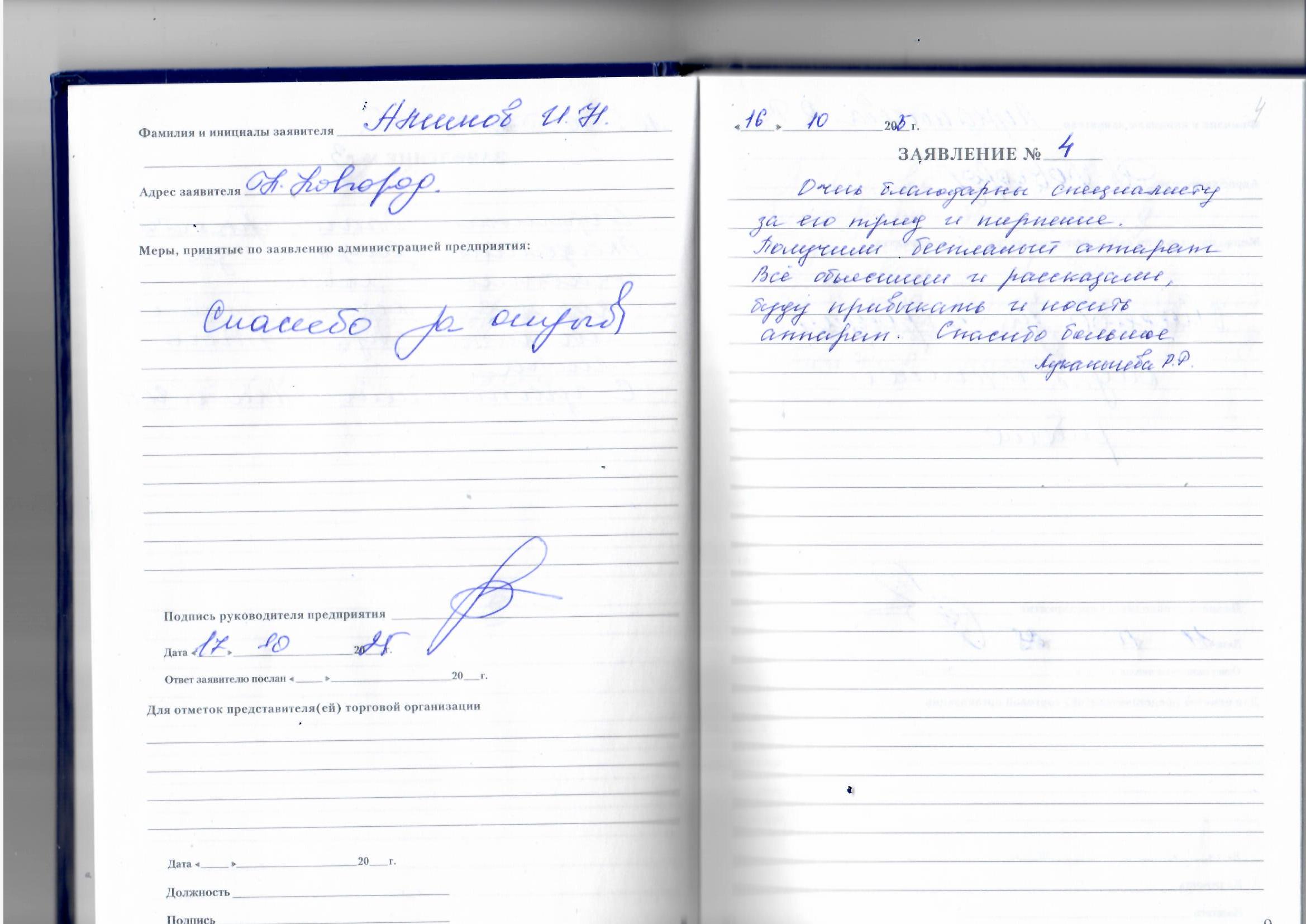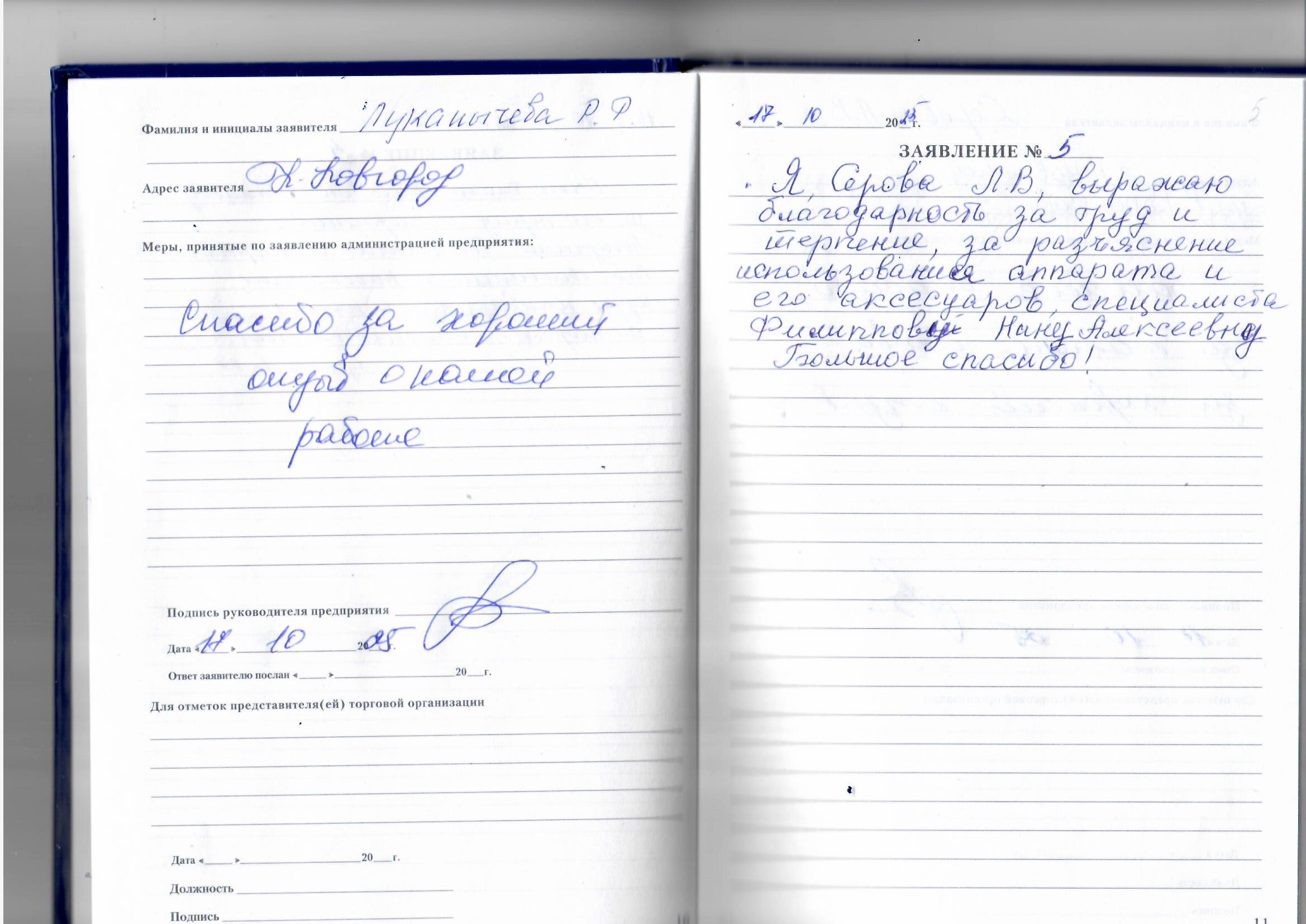Я, Серова Л.В., выражаю благодарность за труд и терпение, за разъяснение использования аппарата и его аксессуаров, специалиста Филиппову Нину Алексеевну. Большое спасибо!