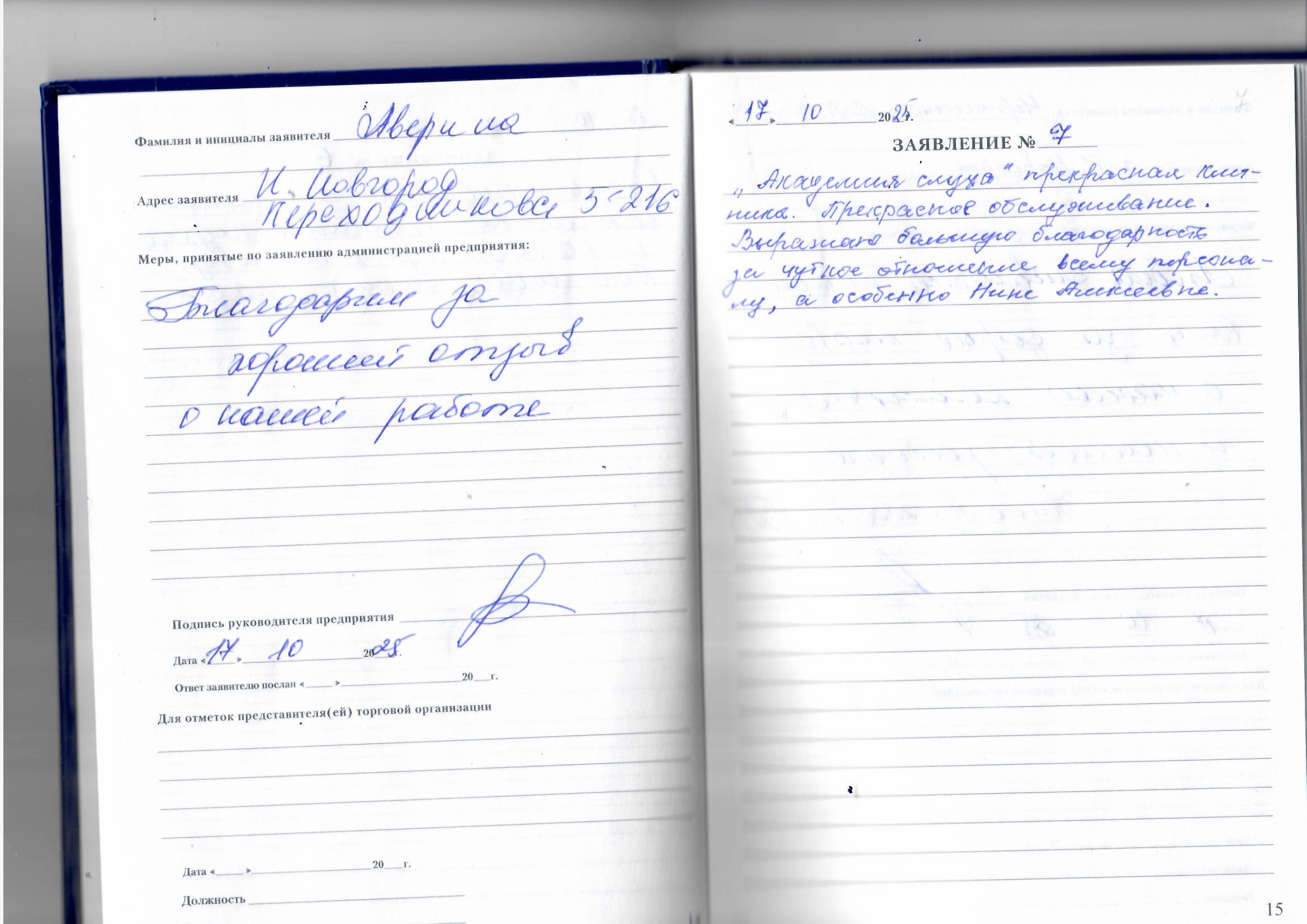 Я, Ильин Ал. Иван., обслуживаюсь в "Академии Слуха". Очень доволен. Обслуживающий персонал внимательный, все объяснят, посоветуют. Объявляю свою благодарность.