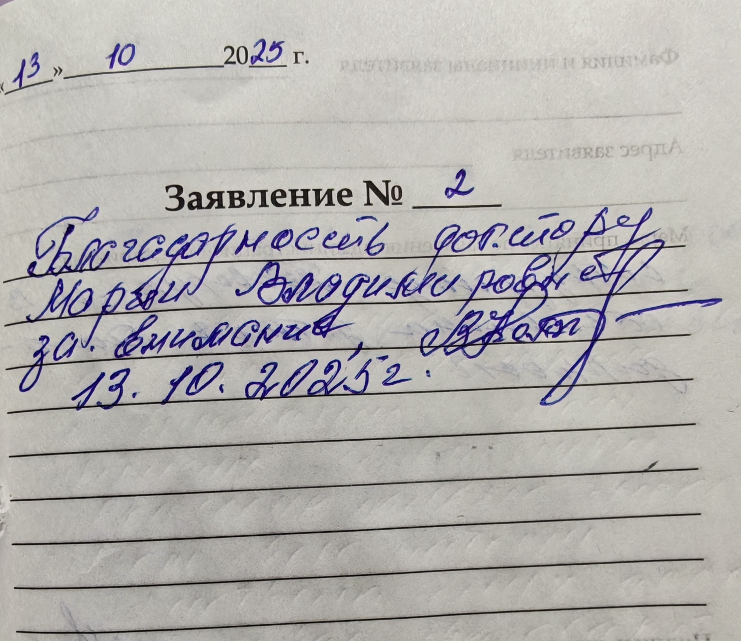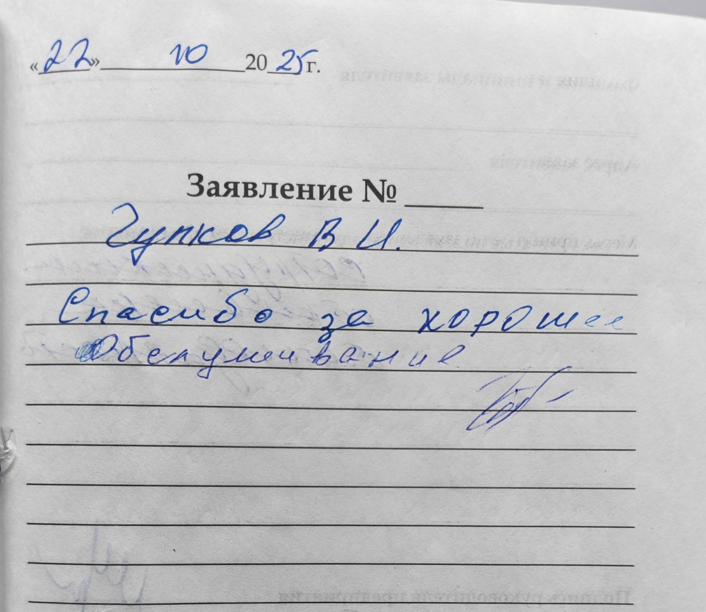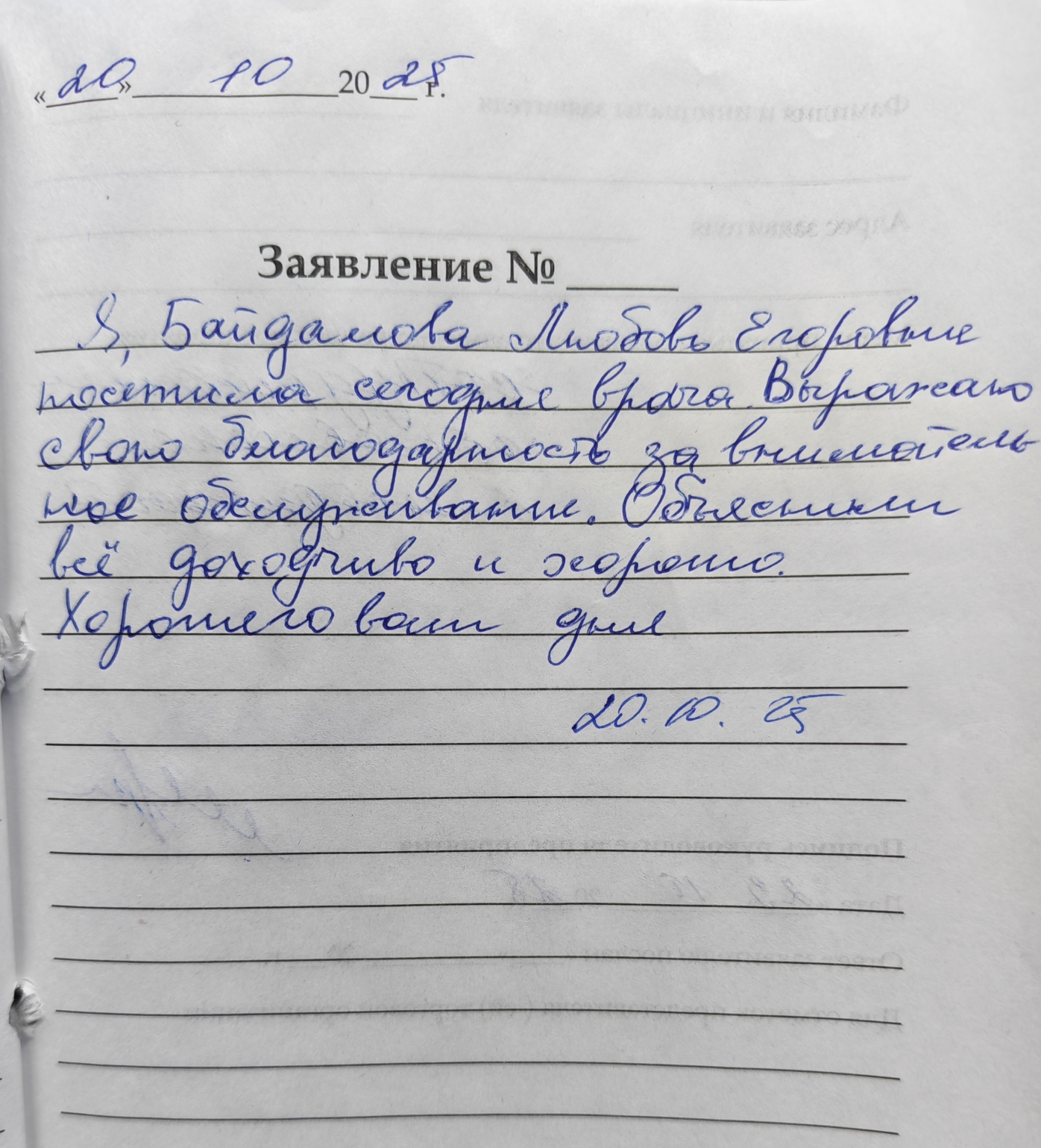 Я, Байдалова Любовь Егоровна, посетила сегодня врача. Выражаю свою благодарность за внимательное обслуживание. Объяснили всё доходчиво и хорошо. Хорошего Вам дня. 20.10.2025