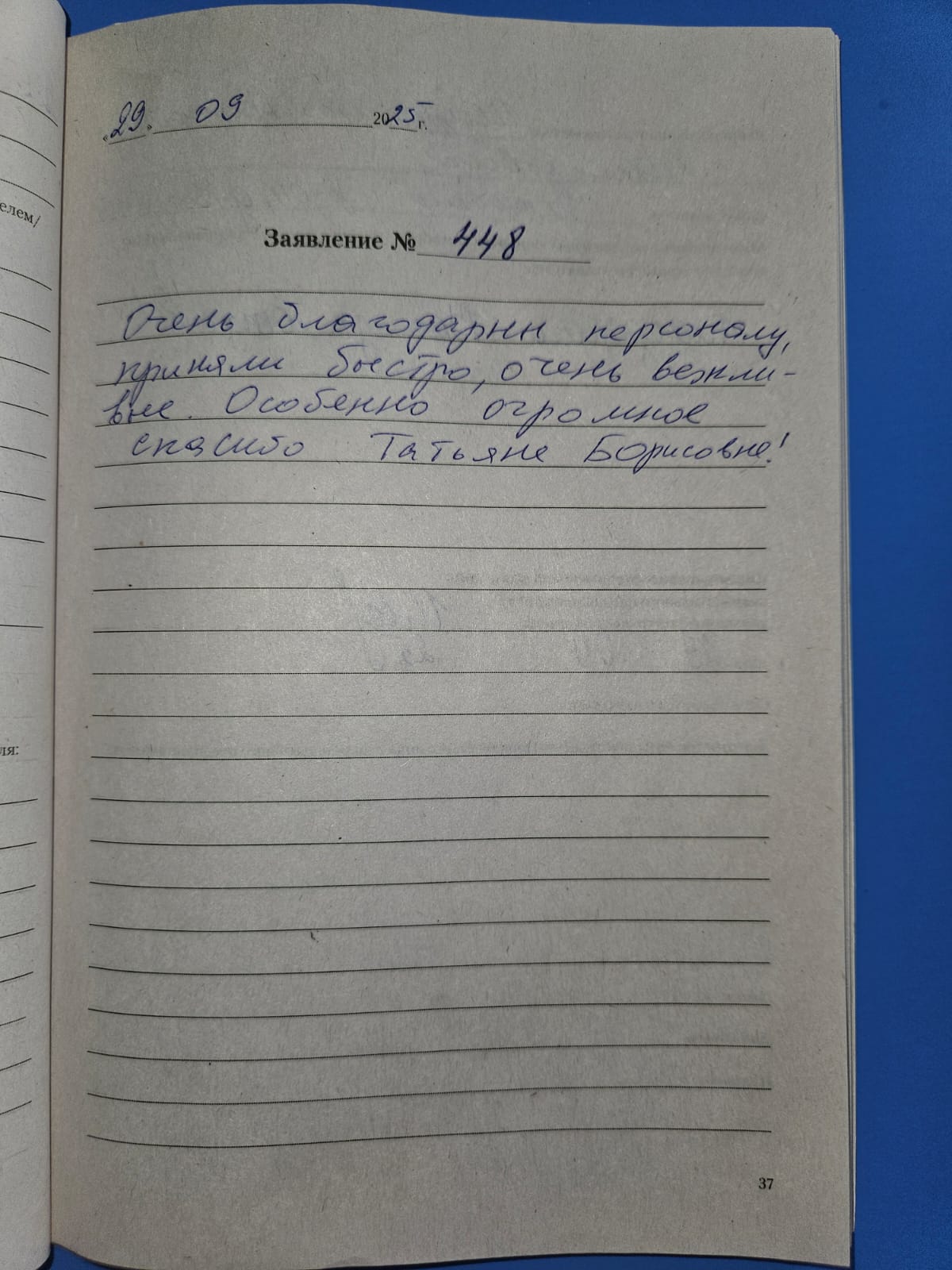Очень благодарны персоналу, приняли быстро, очень вежливые. Особенно огромное спасибо Татьяне Борисовне!
