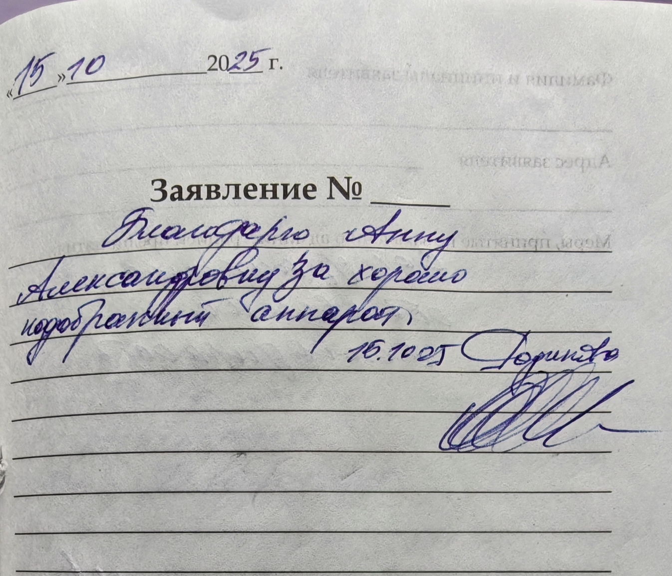 Благодарю Анну Александровну за хорошо подобранный аппарат. 15.10.2025 Родикова.