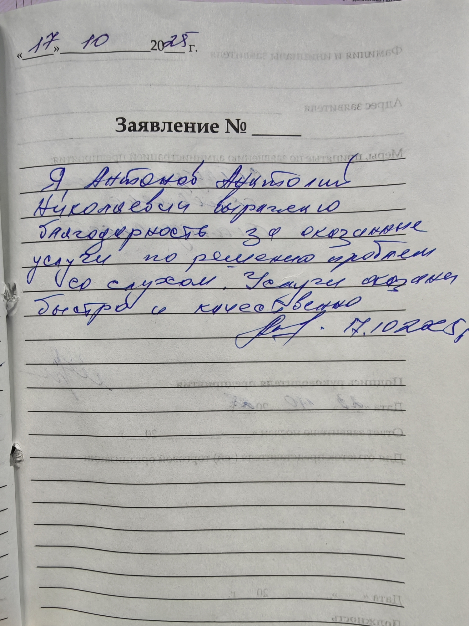 Я, Антонов Анатолий Николаевич, выражаю благодарность за оказанные услуги по решению проблем со слухом. Услуги оказаны быстро и качественно. 17.10.2025