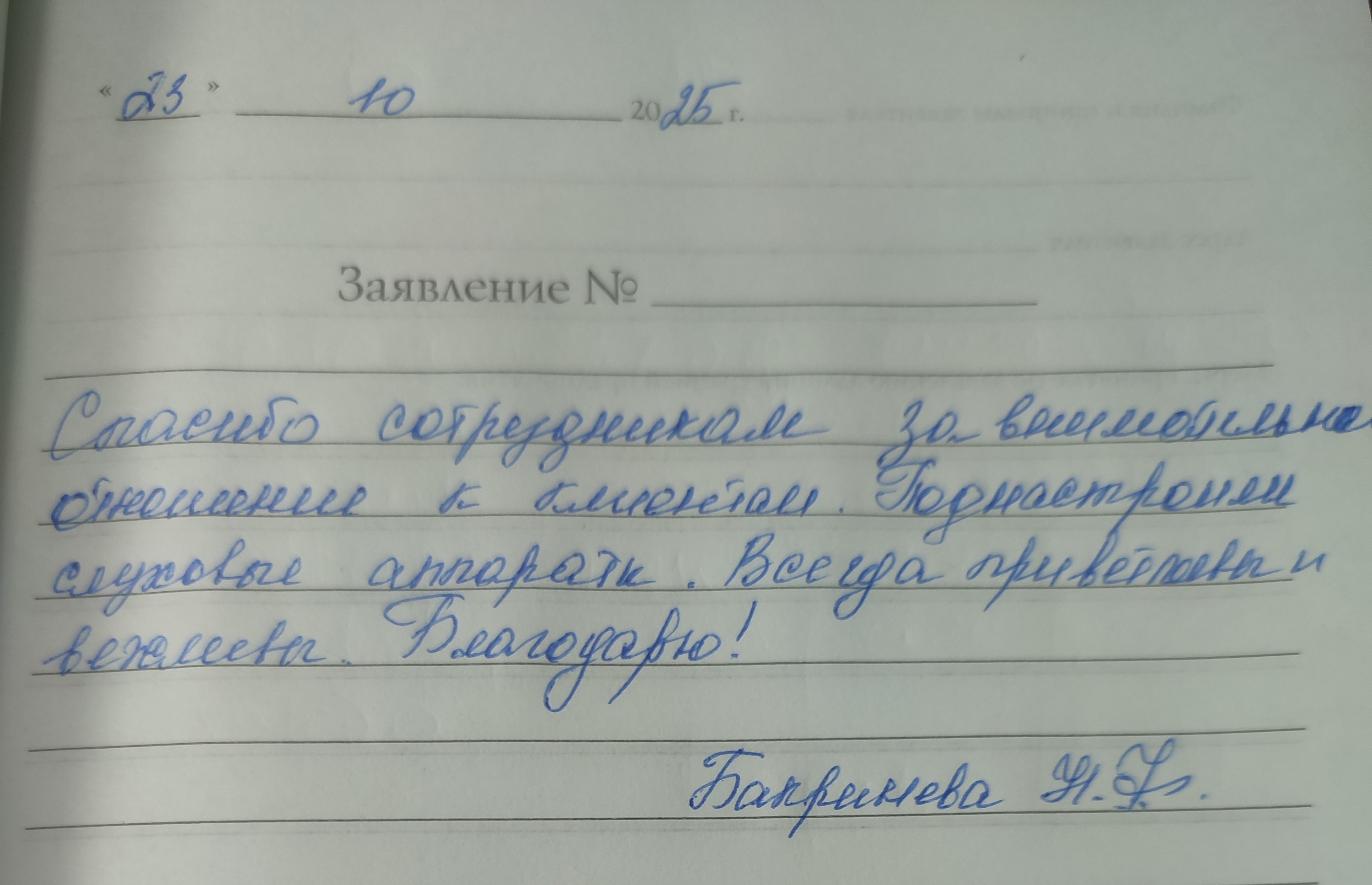 Я, Тельцова Валентина Николаевна неоднократно посещала "Академию слуха" и всегда встречала доброжелательное отношение. Сегодня 1 октября 2025г. меня обслуживала Ольга Владимировна, терпеливо подбирала и примеряла мне вкладыши. Огромное спасибо ей за душевность и теплоту, с которой она относится к нам, слабослышащим. Здоровья вам, Ольга Владимировна.Никогда не теряйте слуха. А слух сердца и души у вас на пять с плюсом.