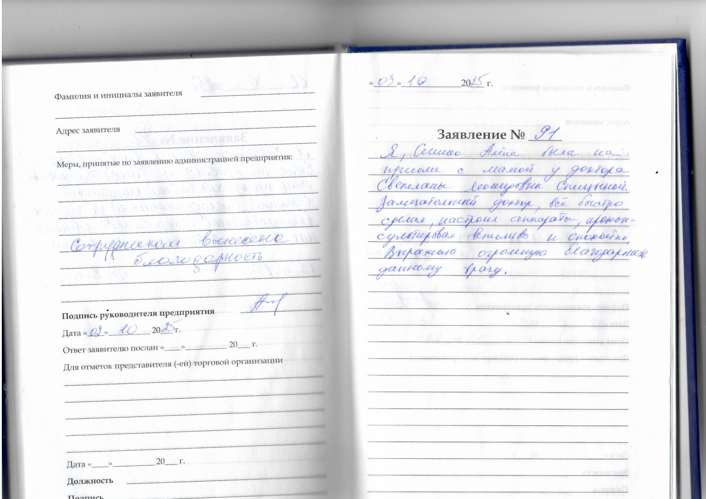 Я. Сенина Алёна была на приеме с мамой у доктора Светланы Леонидовны Спицыной. Замечательный доктор, все быстро сделал, настроил аппараты, проконсультировала вежливо и спокойно. Выражаю огромную благодарность данному врачу.
