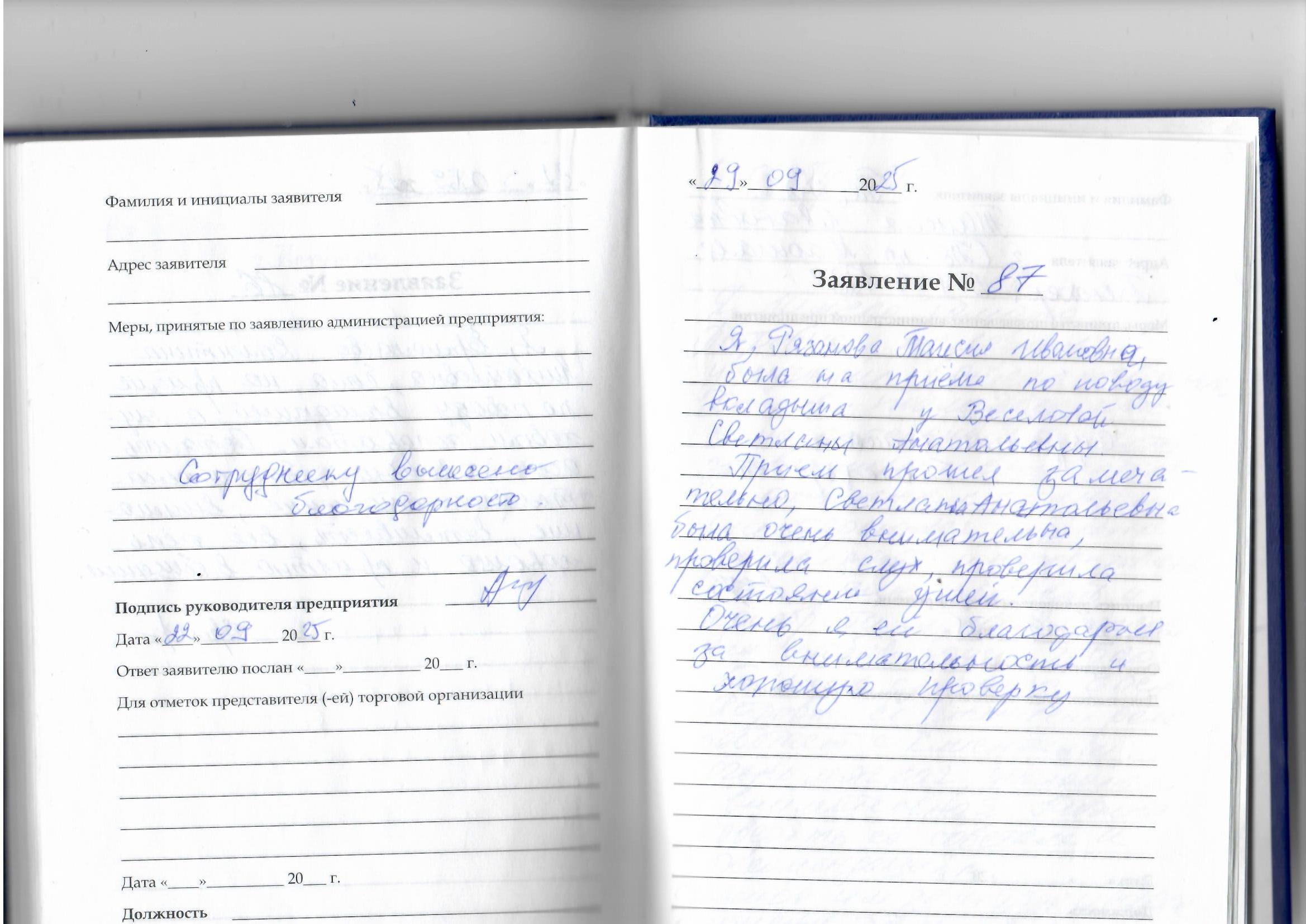 Я. Рязанова Таисия Ивановна , была на приеме по поводу вкладыша у Веселовой Светланы Анатольевны. Прием прошел замечательно, Светлана Анатольевна была очень внимательна ,проверила слух, проверила состояние ушей.