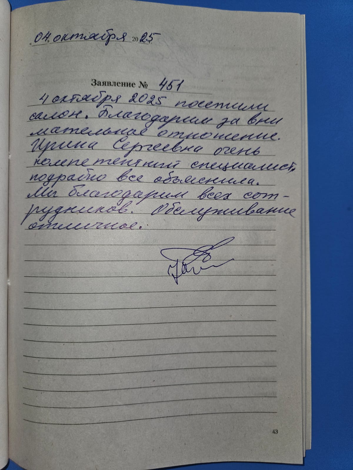 4 октября 2025 посетили салон. Благодарим за внимательное отношение. Ирина Сергеевна очень компетентный специалист, подробно все объяснила. Мы благодарим всех сотрудников. Обслуживание отличное.