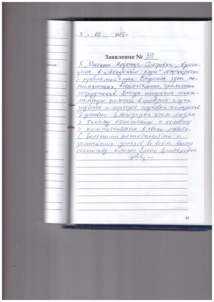 Я, Ишенина Надежда Петровна, приходила в Академию слуха многократно с проблемой слуха. Встретила здесь понимающих,внимательных сотрудников. Всегда получала максимальную помощь в проверке слуха, подборе и настройке слуховых аппаратов. Душевно благодарна этим людям к такому отношению к человеку и компетентным в своей работе. С большими пожеланиями и дальнейших успехов во всём всему коллективу и лично Елене Викторовне.