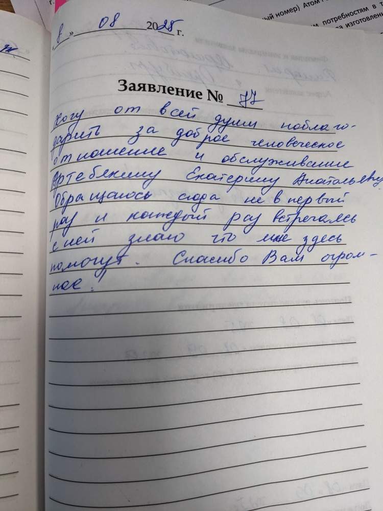 Хочу от всей души поблагодарить за доброе человеческое отношение и обслуживание Артебякину Екатерину Анатольевну. Обращаюсь сюда не в первый раз и каждый раз, встречаясь с ней, знаю. Что мне здесь помогут. Спасибо Вам огромное!