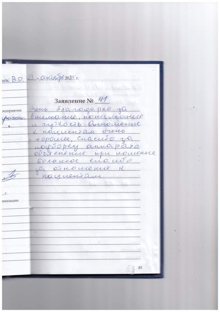 Очень благодарна за внимание, понимание и чуткость. Отношение к пациентам очень хорошее, спасибо за подборку аппарата, Объяснение при ношении. Большое спасибо за отношение к пациентам.