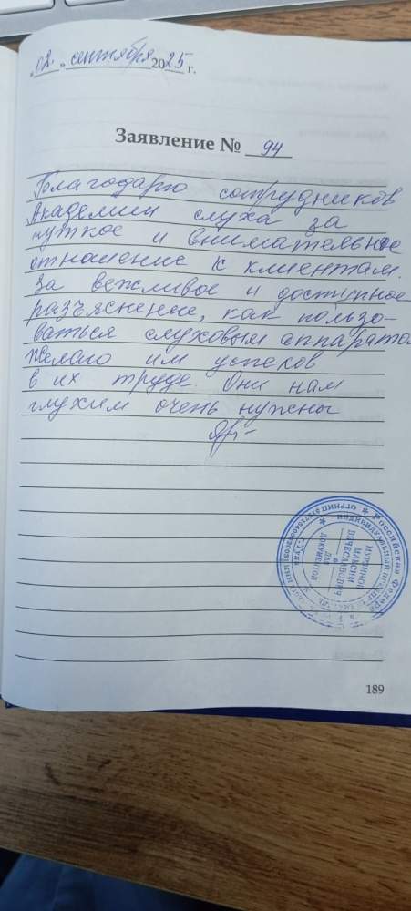 Благодарю сотрудников Академии слуха за чуткое и внимательное отношение к клиентам. За вежливое и доступное разъяснение,как пользоваться аппаратом.Желаю им успехов в их труде. Они нам глухим очень нужны.