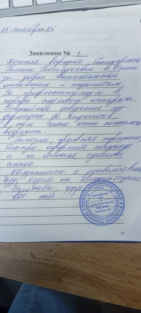 Хочется выразить благодарность Галине Геннадьевне и Елене за доброе внимательное отношение к пациентам.За профессионализм в подборе слухового аппарата.Спокойное доведение информации до пациентов,в том числе очень пожилого возраста.