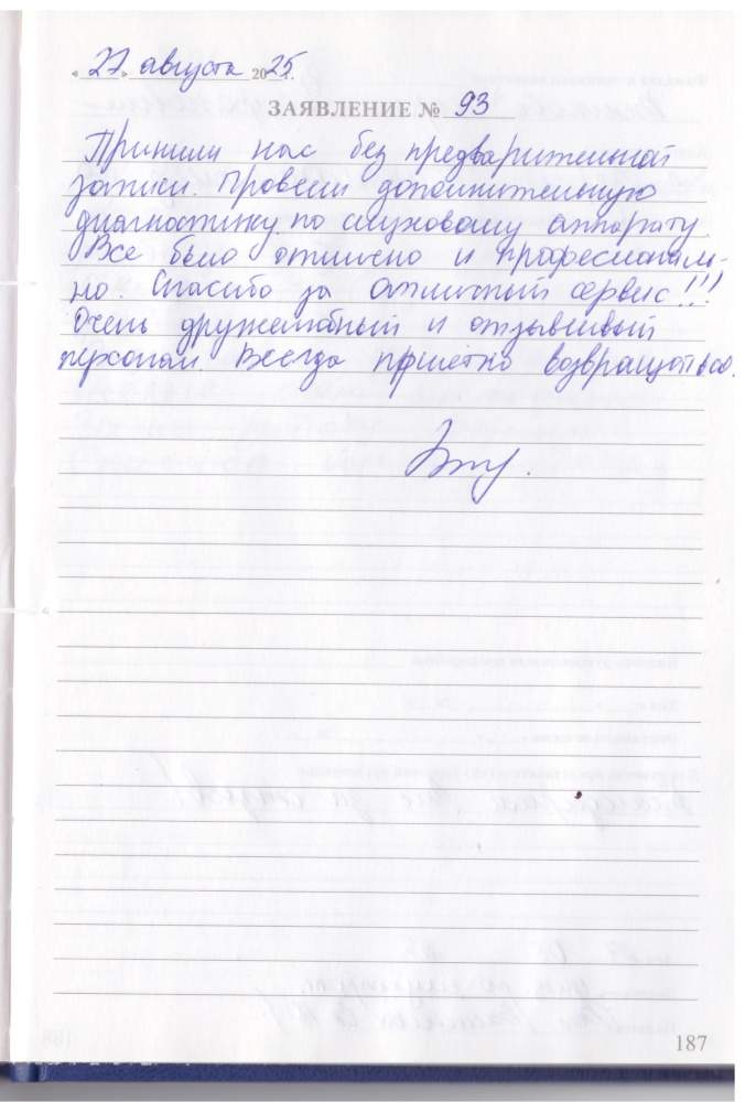Приняли нас без предварительной записи. Провели дополнительную диагностику по слуховому аппарату. Все было отлично и профессионально. Спасибо за отличный сервис!!! Очень дружелюбный и отзывчивый персонал. Всегда приятно возвращаться.