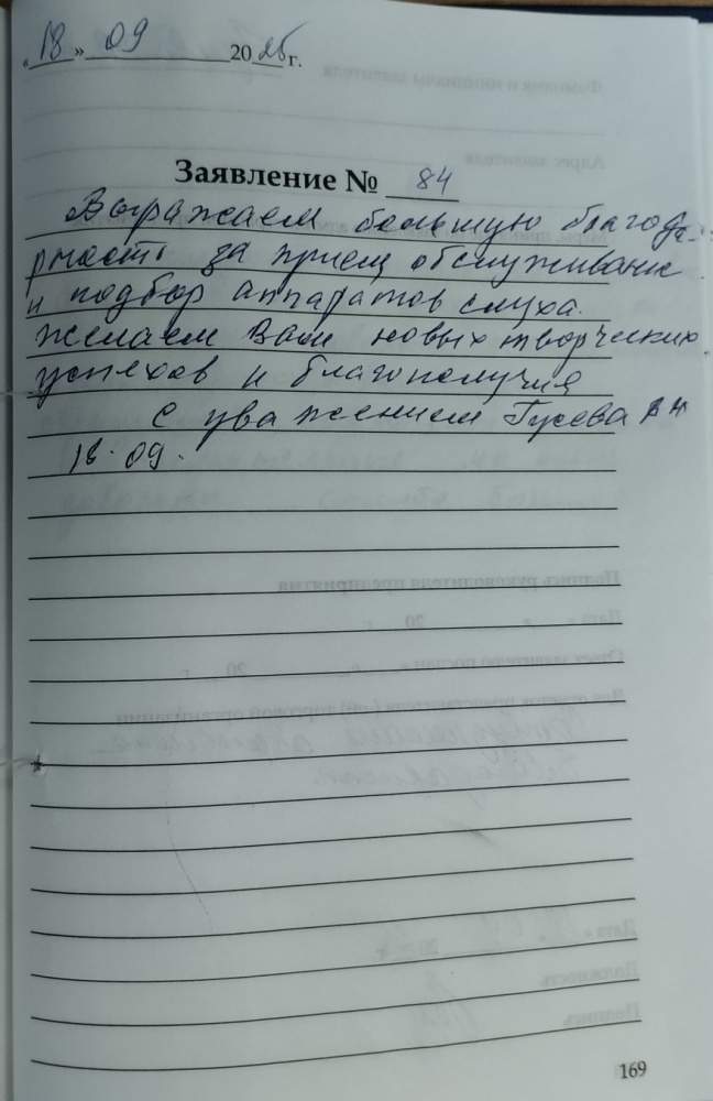 Выражаем большую благодарность за прием , обслуживание и подбор аппаратов слуха. Желаем вам новых творческих успехов и благополучия. С уважением Гусева В.М.