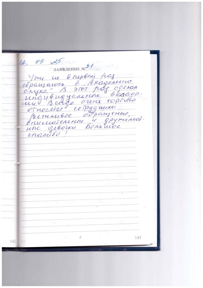Хочу поблагодарить сотрудников центра Академия слуха за внимательное отношение к людям с плохим слухом. После приема и подбора слухового аппарата я получила подробную консультацию по уходу за аппаратом, как быстро привыкнуть, как им пользоваться. Для пожилых людей это очень сложно и важно .Еще раз спасибо и всего вам доброго!