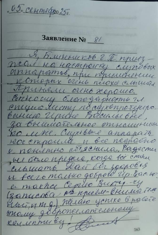 Я, Блинников Г.П. приезжал на настройку слуховых аппаратов, при применении которых очень плохо слышал. Приняли очень хорошо. Выношу благодарность гл.специалисту по слухопротезированию Ирине Васильевне, за внимательное отношение ко мне. Слуховые аппараты настроила и все подробно и понятно объяснила. Радости не было предела, когда все стал слышать. Дай бог здоровья и всего только доброго Ирине Васильевне, а также Сергею Викторовичу(записывал на прием, внимательный и т.д.). Желаю успехов в работе этому доброжелательному коллективу!