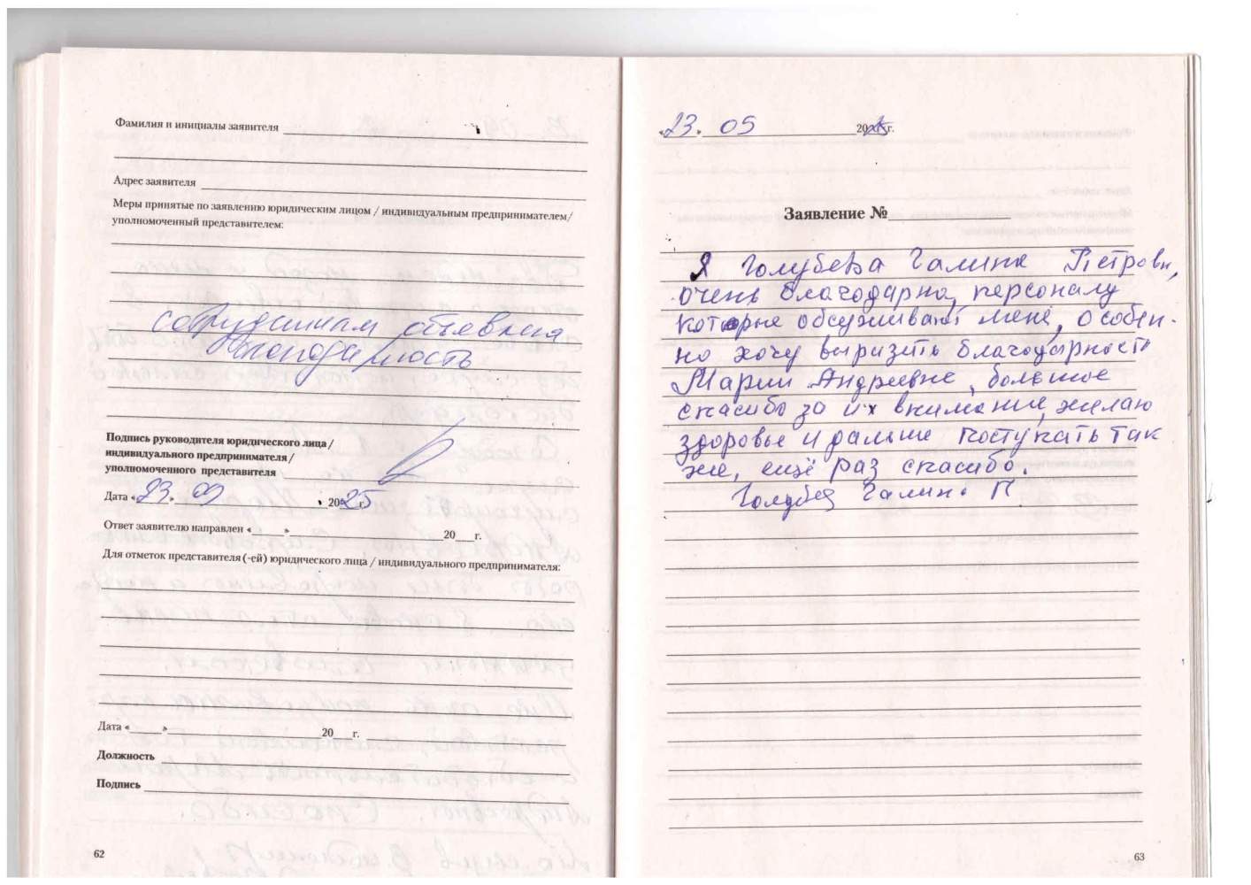 Я, Голубева Галина Петровна, очень благодарна персоналу, которые обслуживали меня, особенно хочу выразить благодарность Марии Андреевне, большое спасибо за их внимание, желаю здоровья и дальше поступать также, еще раз спасибо.
