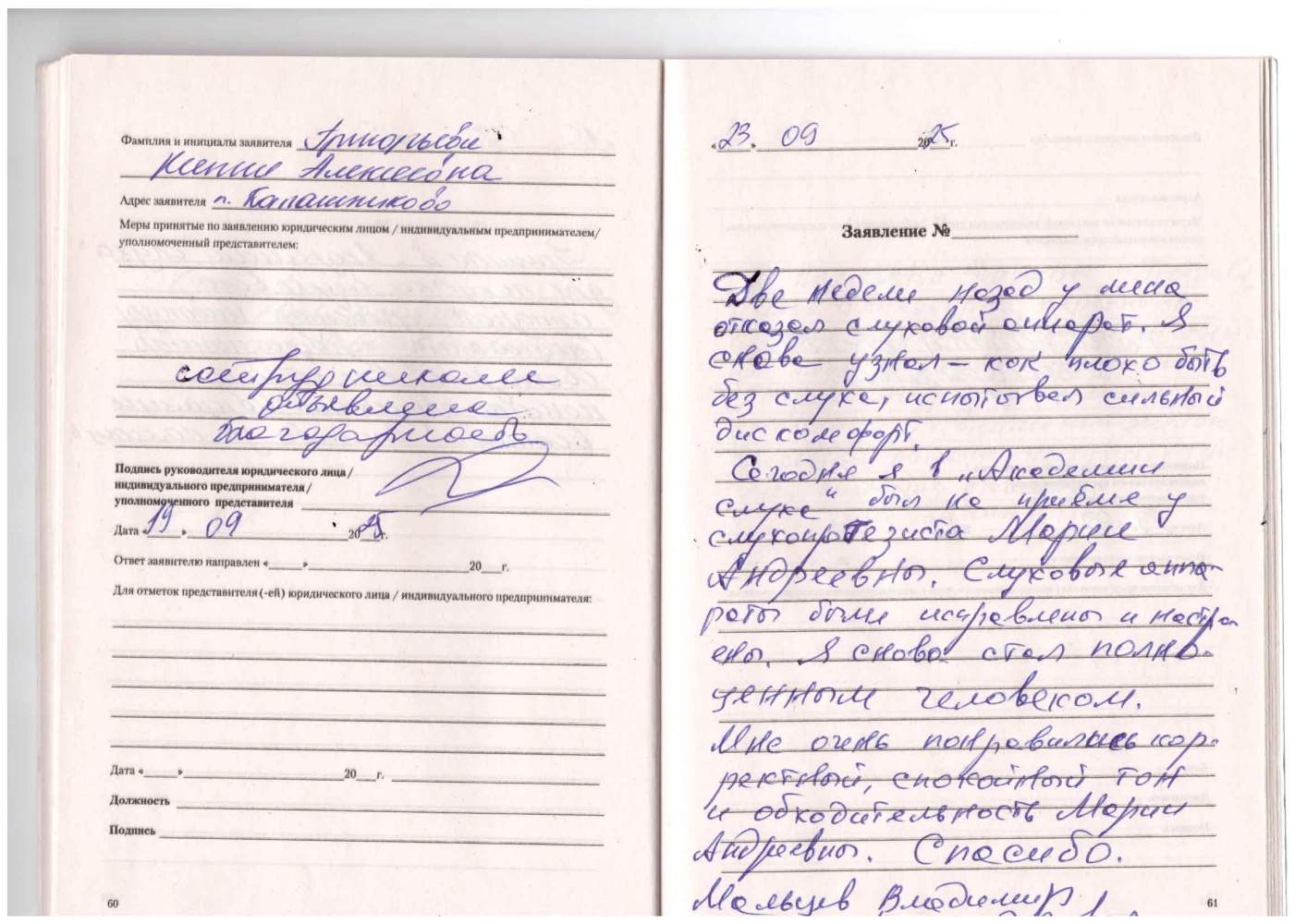 Две недели назад у меня отказал слуховой аппарат. Я снова узнал - как плохо быть без слуха, испытывал сильный дискомфорт. Сегодня я в "Академии слуха" был на приеме у слухопротезиста Марии Андреевны. Слуховые аппараты были исправлены и настроены. Я снова стал полноценным человеком. Мне очень понравились корректный, спокойный тон и обходительность Марии Андреевны. Спасибо.