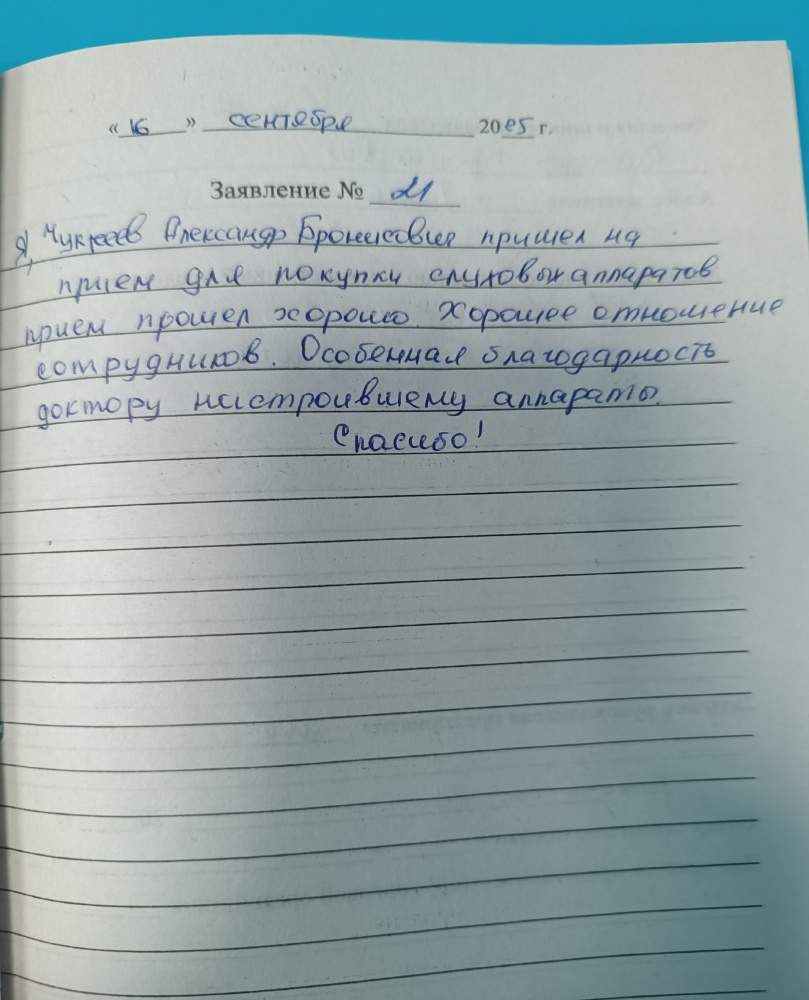 Я, Чукреев Александр Бронисович пришел на прием для покупки слуховых аппаратов приём прошёл хорошо. Хорошее отношение сотрудников. Особенная благодарность доктору настроившему аппараты. Спасибо!
