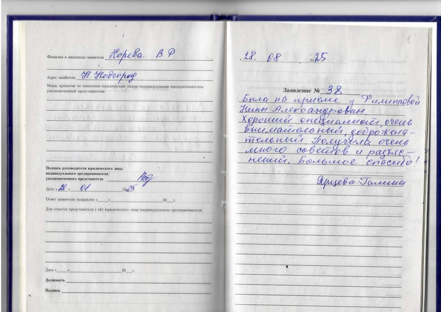 Была на приеме у Филипповой Нины александровны. Хороший специалист, очень внимательный, доброжелательный. получила очень много советов и разъяснений. Большое спасибо. Ярцева Галина