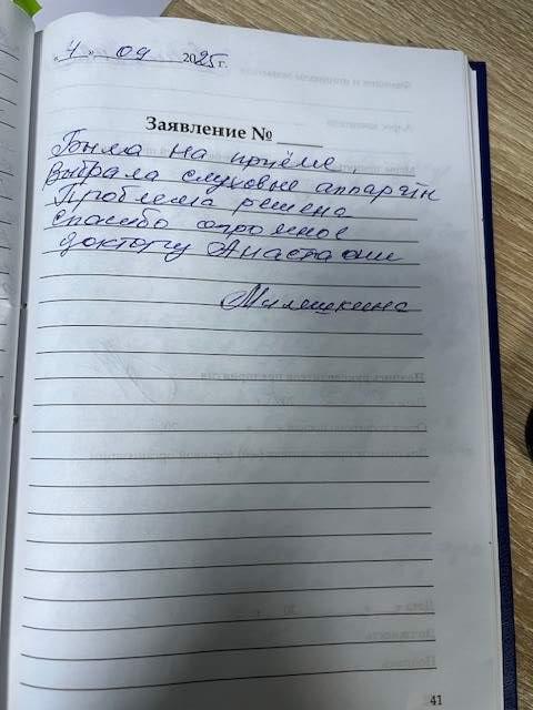 Была на приеме. Выбрала слуховые аппараты. Проблема решена. Спасибо огромное доктору Анастасии.