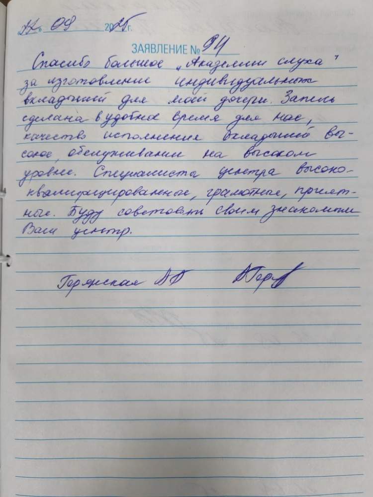 Спасибо большое "Академии слуха" за изготовление индивидуальных вкладышей для моей дочери. Запись сделана в удобное время для нас, качество исполнение вкладышей высокая, обслуживание на высоком уровне. Специалисты центра высококвалифицированные, грамотные, приятные. Буду советовать своим знакомым ваш центр.