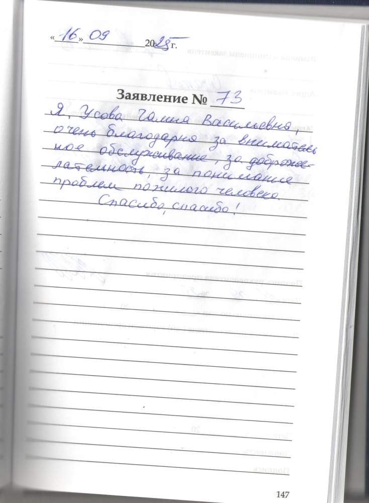 Я, Усова Галина Васильевна, очень благодарна за внимательное обслуживание, за доброжелательность, за понимание проблем пожилого человека. Спасибо, спасибо!