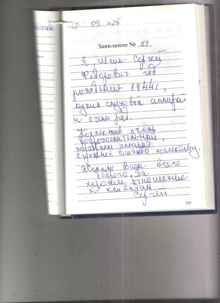 Я,Шейн Сергей Фёдорович,год рождения 1944,купил слуховой аппарат и очень рад. Коллектив очень доброжелательный.Огромное спасибо коллективу.Желаю Всем всего доброго,за хорошее отношение к клиентам. Сергей
