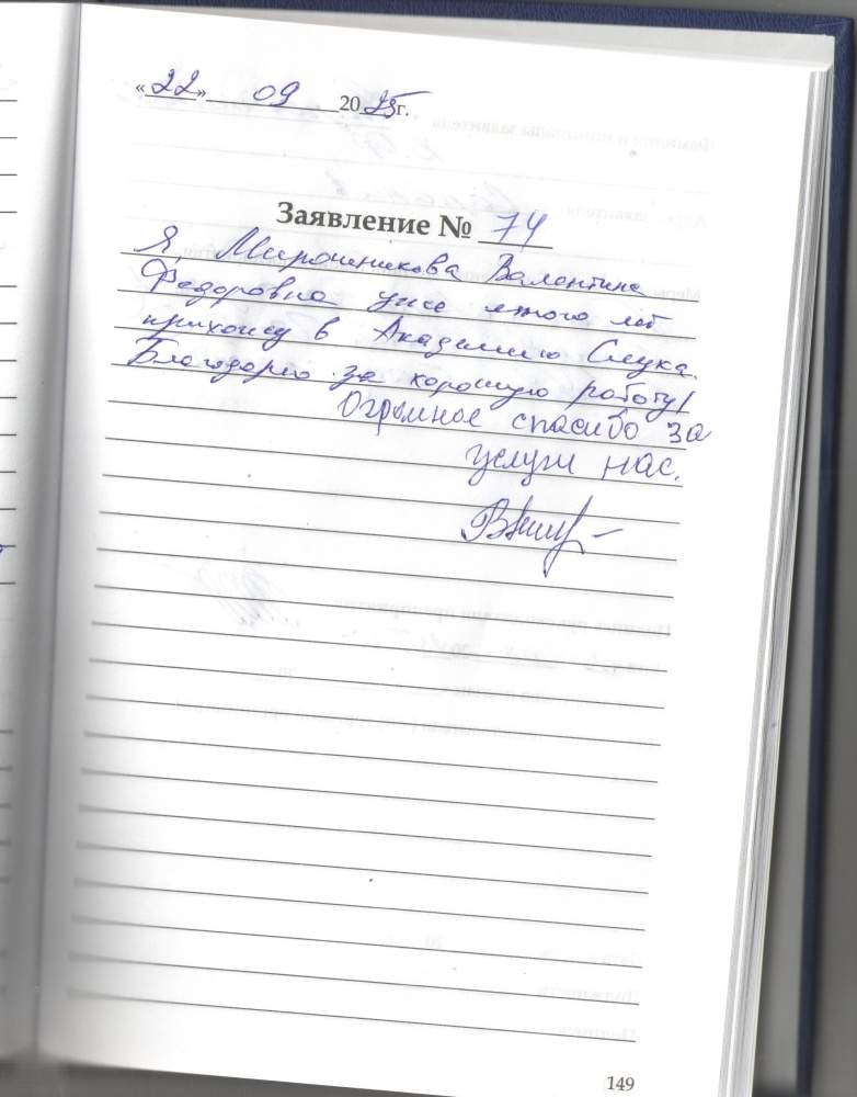 Я, Мирошникова Валентина Федоровна, уже много лет прихожу в "Академию Слуха". Благодарю за хорошую работу!