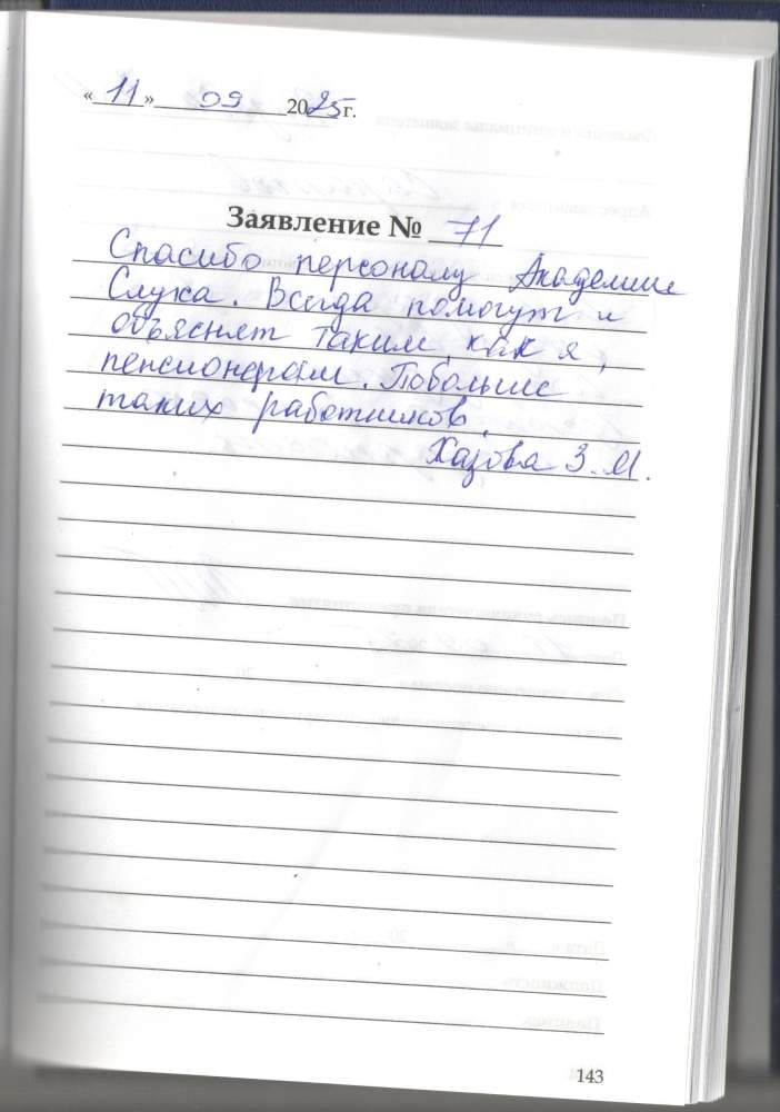 Спасибо персоналу "Академии Слуха". Всегда помогут и объяснят таким, как я пенсионерам. Побольше таких работников.