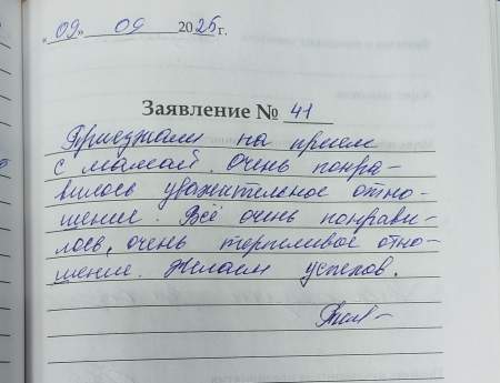 Приезжали на прием с мамой.Очень понравилось уважительное отношение.Все очень понравилось, очень терпеливое отношение. Желаем успехов.