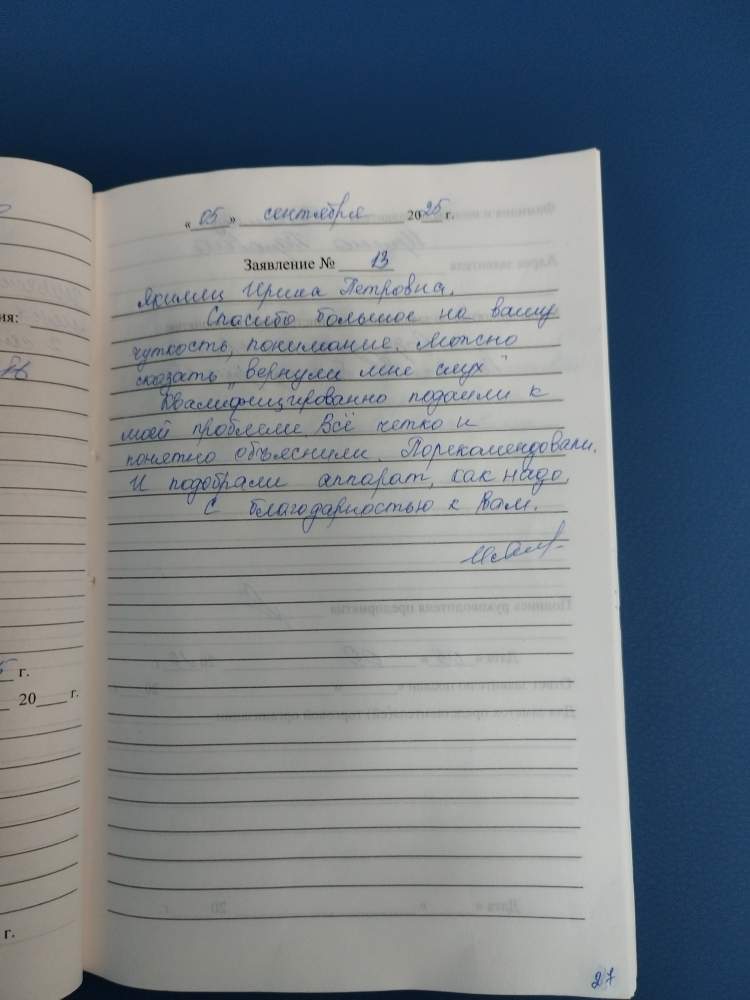 Спасибо большое за вашу чуткость, понимание. Можно сказать "Вернули мне слух". Квалифицированно подали к моей проблеме. Все четко объяснили. Порекомендовали. И подобрали аппарат, как надо! С благодарностью к вам!.