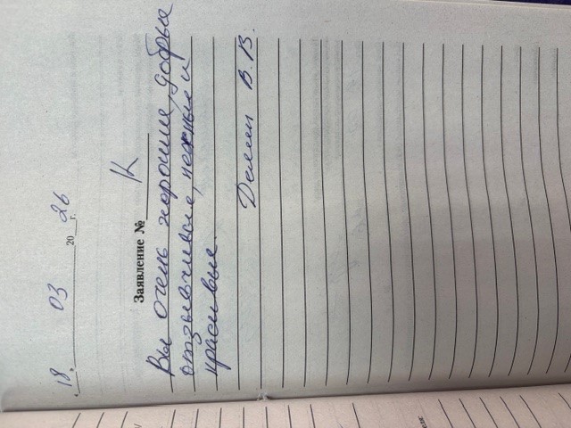 Я, Иванова Нина Юрьевна, выражаю благодарность Инне Александровне за приятное отношение и обслуживание. Большое спасибо. Иванова.