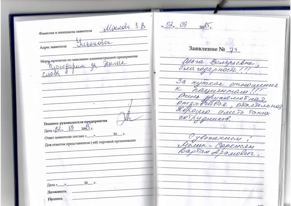 Ольге Валерьевне, благодарность !!! За чуткое отношение к пациентам!!!! Очень дружелюбная , отзывчивая, обаятельная . Хорошо иметь таких сотрудников . С Уважением Мелик-Саркисян Вартан Арамович .