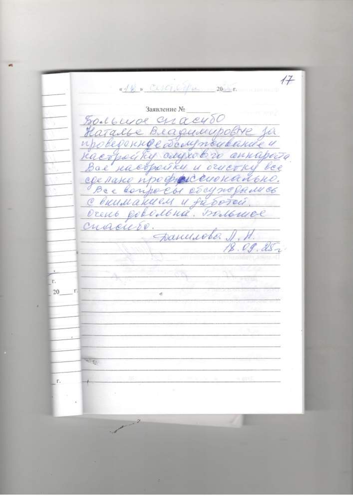 Большое спасибо Наталье Владимировне за проведенное обслуживание и настройку слухового аппарата. Все настройки и очистку все сделано профессионально. Все вопросы обсуждались с вниманием и заботой. Очень довольна. Большое спасибо.