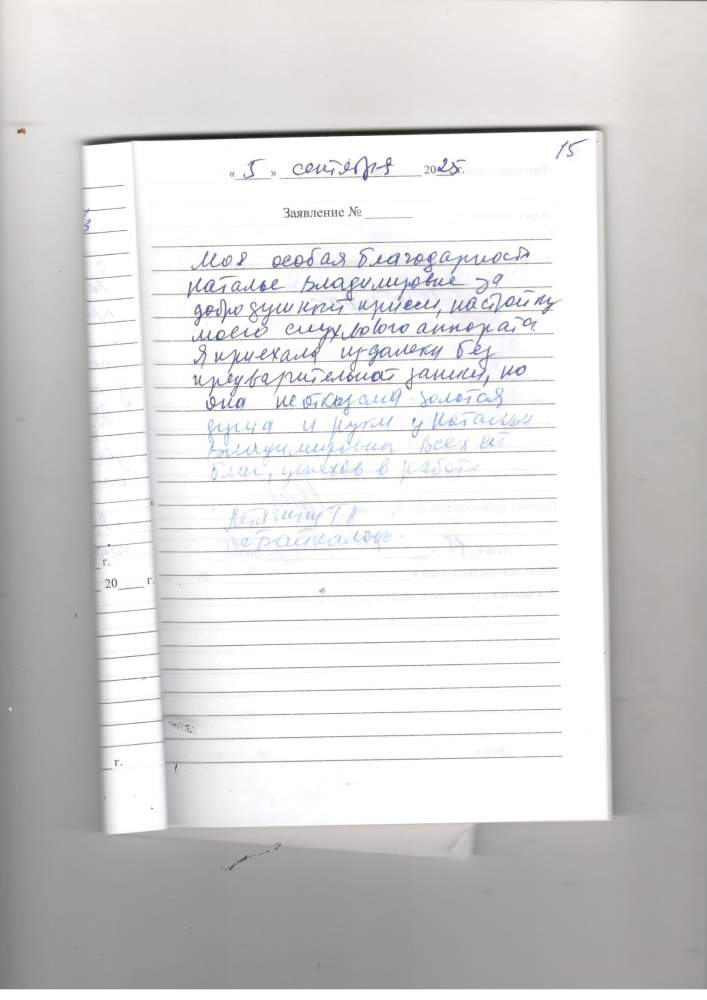 Моя особая благодарность Наталье Владимировне за добродушный прием, настройку моего слухового аппарата .Я приехала издалека без предварительной записи, но она не отказала ,золотая душа и руки у Натальи Владимировны. Всех ей благ, успехов в работе.