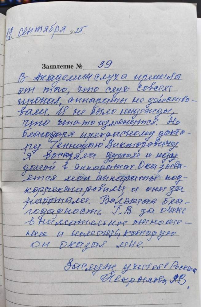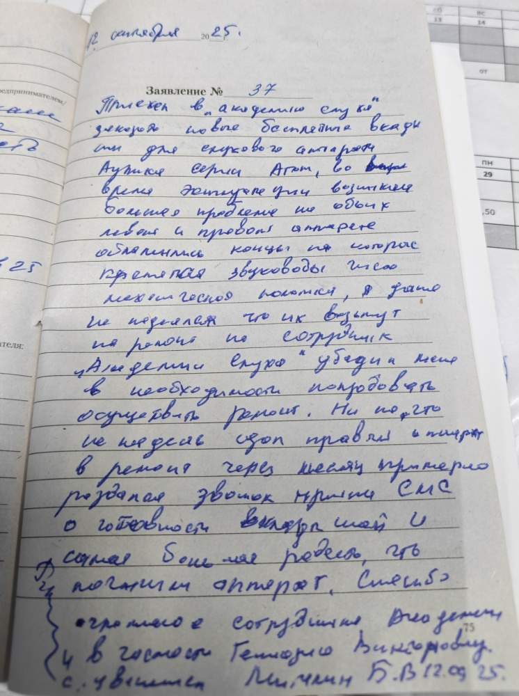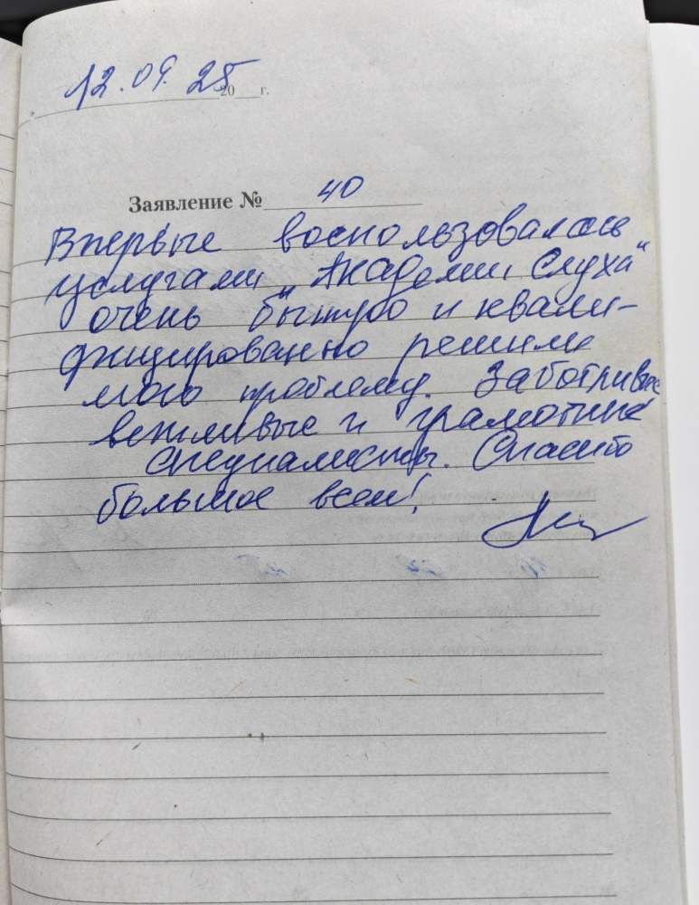 Приехал в «Академию Слуха» заказать новые бесплатные вкладыши для слухового аппарат Аурика серия Атом, во время эксплуатации возникли большие проблемы на обоих левый и правый аппараты обломились концы, на которые крепятся звуководы чисто механические поломки, я даже не надеялся, что их возьмут в ремонт, но сотрудник «Академии Слуха» убедил меня в необходимости попробовать осуществить ремонт. Ни на что не надеясь, сдал правый аппарат в ремонт. Через месяц примерно раздался звонок, пришло смс о готовности вкладышей и самая большая радость, что получили аппарат. Спасибо огромное сотрудникам Академия и в частности Геннадию Викторовичу. С уважениями Мигалин Б.В. 12.09.25