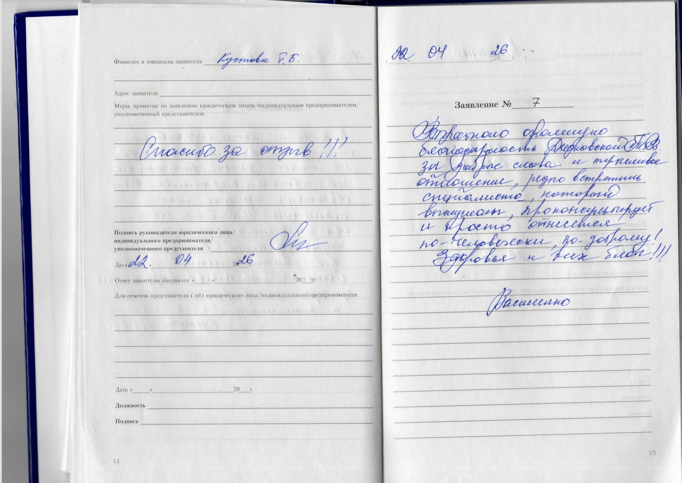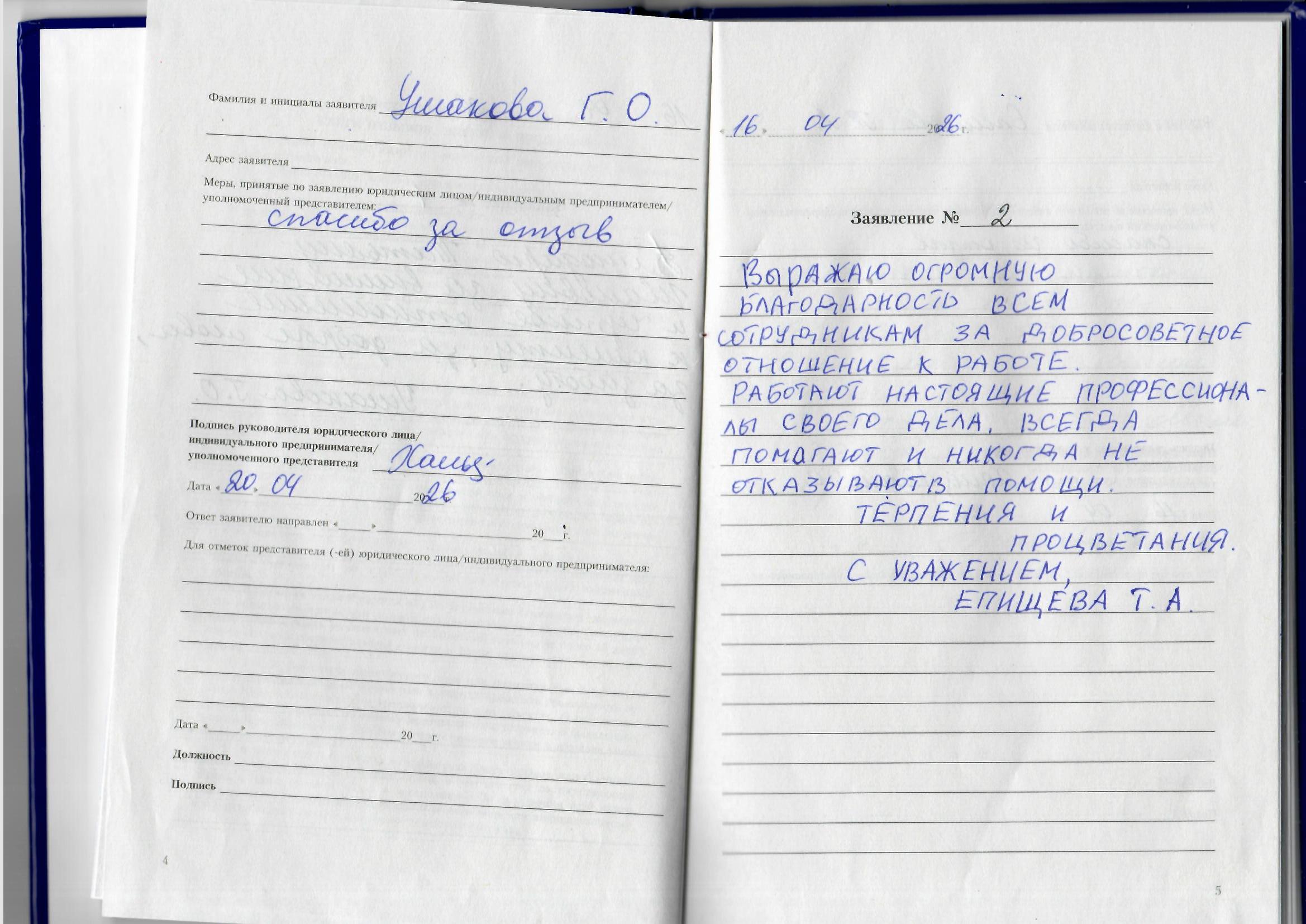 Выражаю огромную благодарность всем сотрудникам за добросовестное отношение к работе. Работают настоящие профессионалы своего дела, всегда помогают и никогда не отказывают в помощи. Терпения и процветания. С уважением, Епищева Т.А.