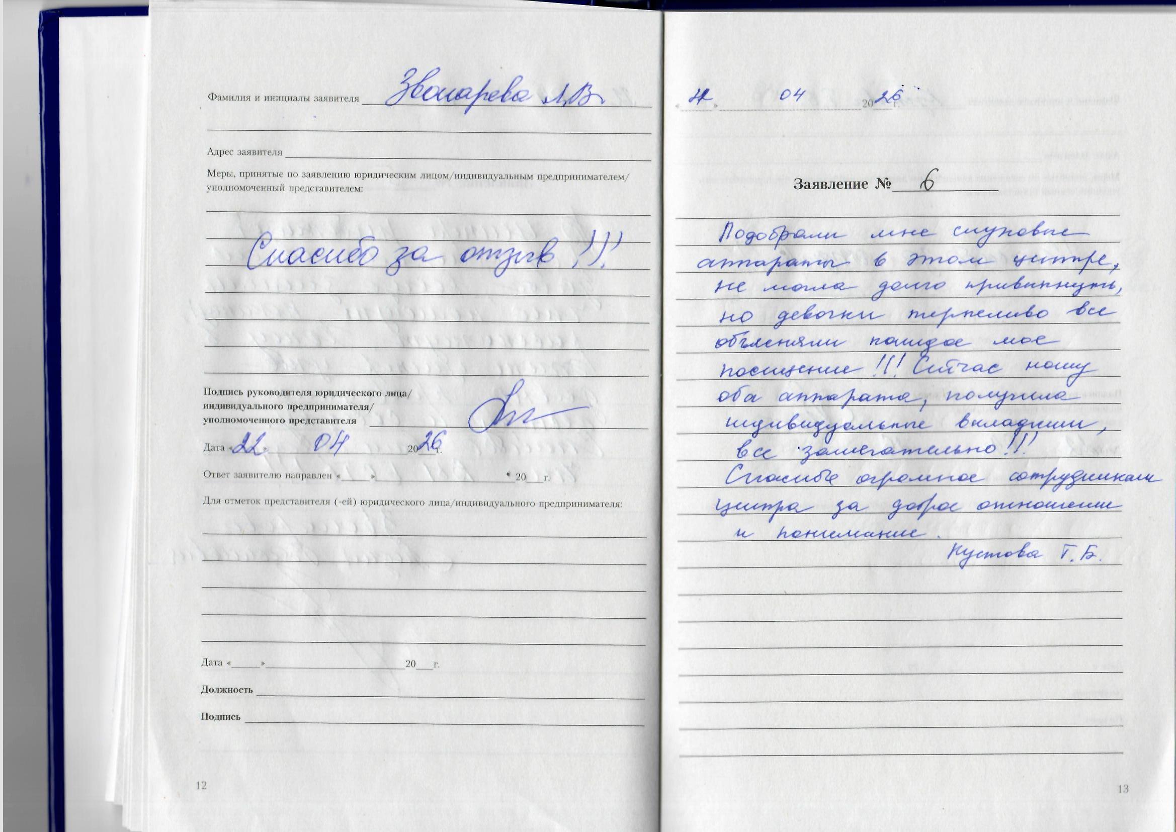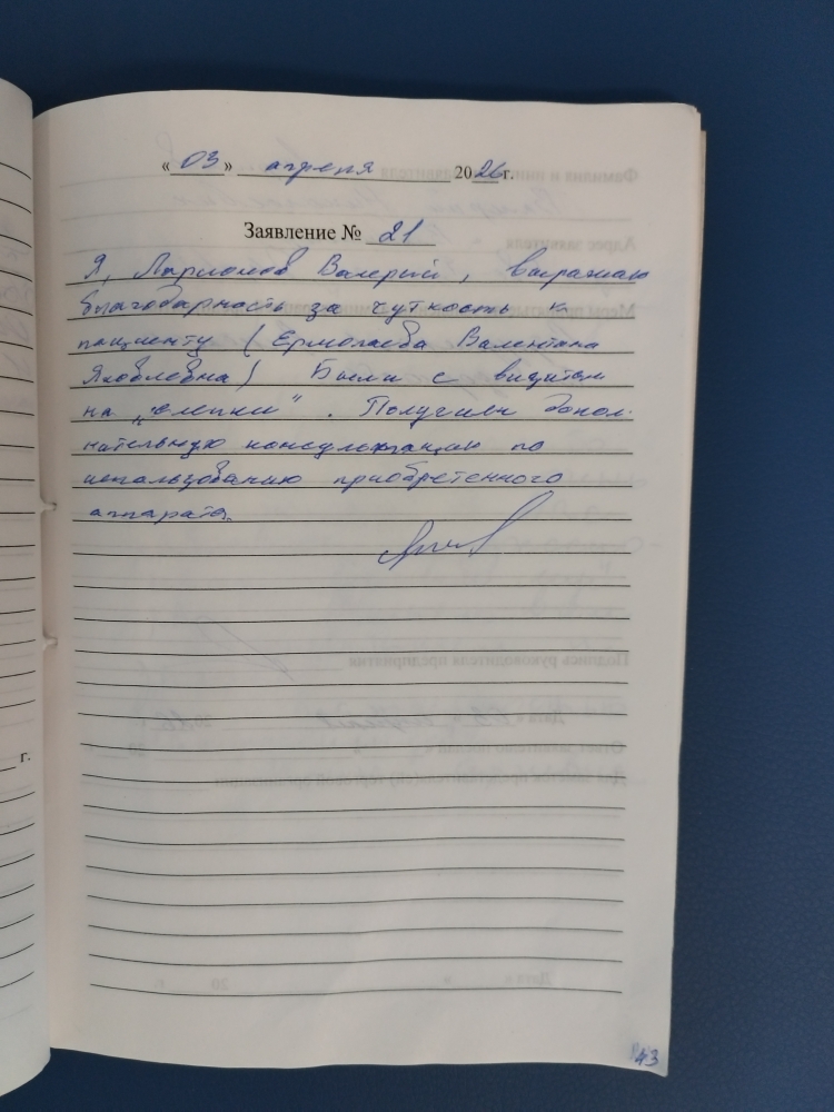 Я, Ларионов Валерий Николаевич, выражаю благодарность за чуткость к пациенту (Ермолаева Валентина Яковлевна). Были с визитом на "слепки".Получили дополнительную консультацию по использованию приобретенного аппарата.