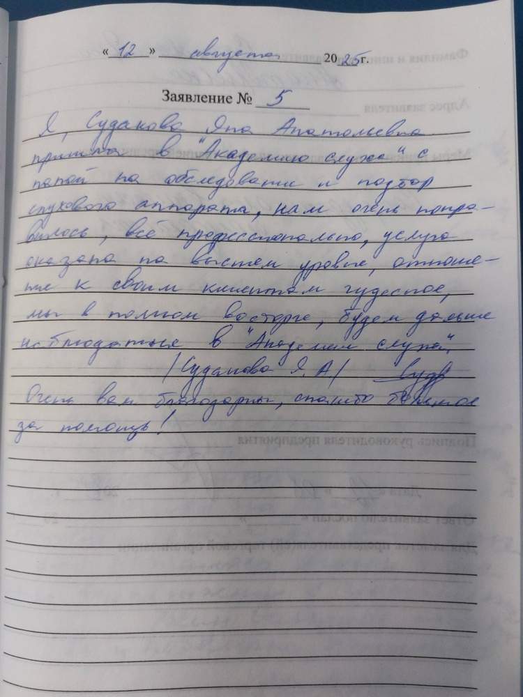 Я, Судакова Яна Анатольевна пришла в Академию слуха с папой, на обследование и подбор слухового аппарата, нам очень понравилось, все профессионально, услуга оказана на высшем уровне, отношение к своим клиентам чудесное, мы в полном восторге,будем дальше наблюдаться в "Академии слуха".Очень вам благодарны, спасибо большое за помощь!