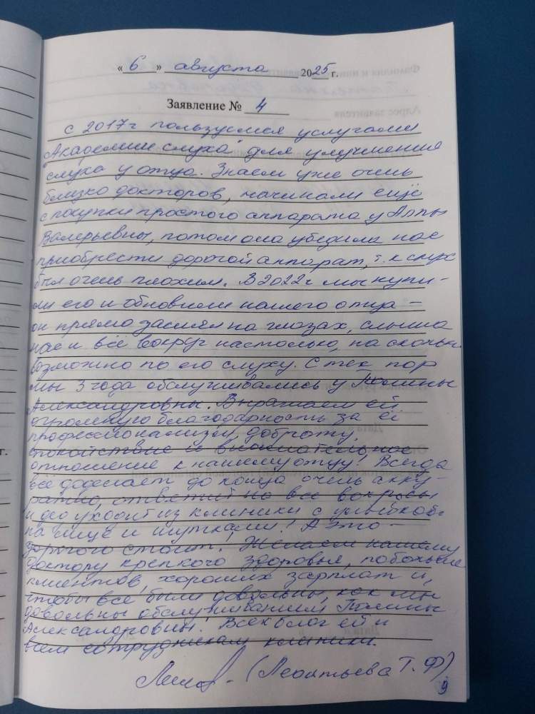 С 2017г. пользуемся услугами Академии слуха для улучшения слуха у отца.Знаем уже близко докторов, начинали еще с покупки простого аппарата у Аллы Валерьевны, потом она убедила нас приобрести дорогой аппарат, т.к слух был очень плохим. В 2022 мы купили его и обновили нашего отца-он прямо засиял на глазах, слыша нас и все вокруг настолько, на сколько возможно по его слуху. С тех пор мы три года обслуживались у Полины Александровны.Выражаем ей огромную благодарность за ее профессионализм, доброту, спокойствие и внимательное отношение к нашему отцу! Всегда все доделает до конца, очень аккуратно, ответит на все вопросы, и дед уходит из клиники с улыбкой на лице и шутками! А это -дорогого стоит! Желаем нашему доктору крепкого здоровья, побольше клиентов, хороших зарплат и чтобы все были довольны, как мв довольны обслуживание Полины Александровны! Всех благ ей и всем сотрудникам клиники.