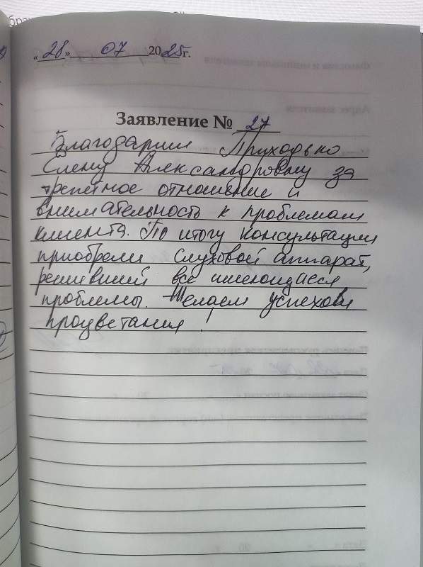Благодарим Приходько Елену Александровну за трепетное отношение и внимательность к проблемам клиента. По итогу консультации приобрели слуховой аппарат,решивший все имеющиеся проблемы. Желаем успехов и процветания!