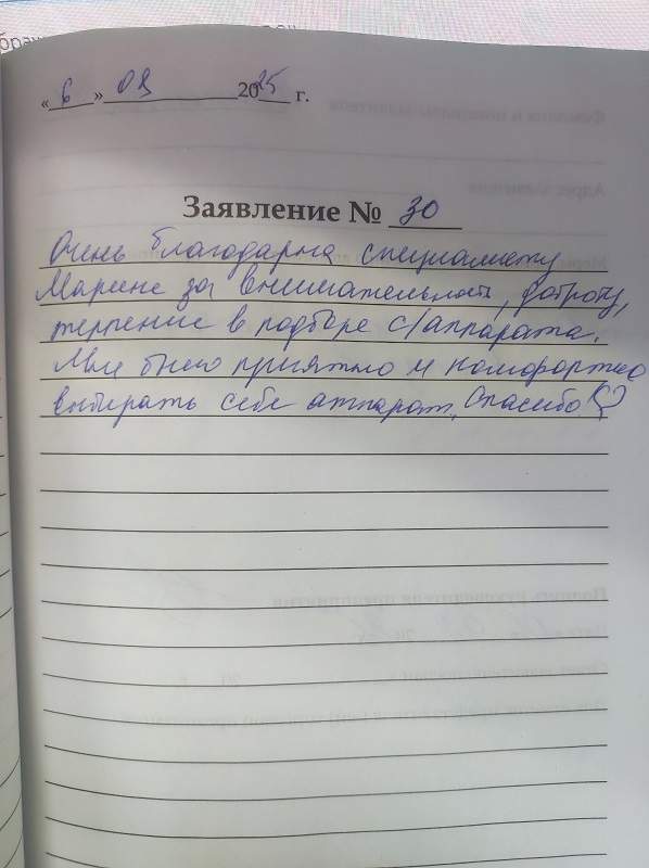 Очень благодарна специалисту Марине за внимательность,доброту,терпение в подборе с/аппарата.Мне было приятно и комфортно выбирать себе аппарат.Спасибо,