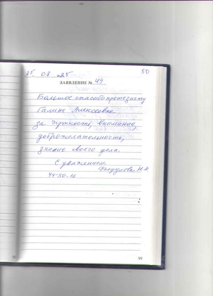 Большое спасибо протезисту Галине Алексеевне за чуткость,внимание, доброжелательность, знание своего дела. С уважением,Федулова Н.М.