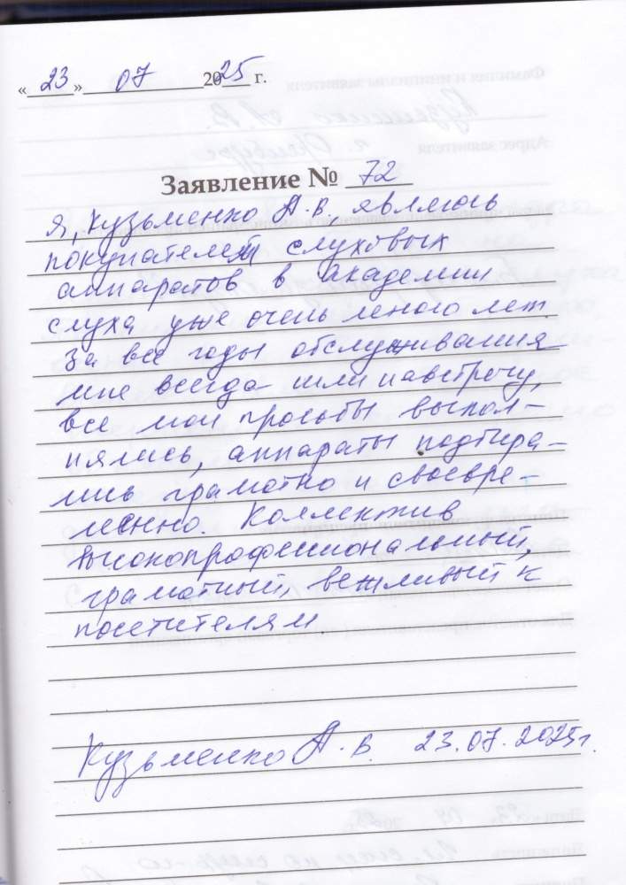 Я, Кузьменко А,В., являюсь покупателем слуховых аппаратов в академии слуха уже очень много лет. За все годы обслуживания мне всегда шли на встречу, все мои просьбы выполнялись, аппараты подбирались грамотно и своевременно. Коллектив высокопрофессиональный, грамотный, вежливый к посетителям